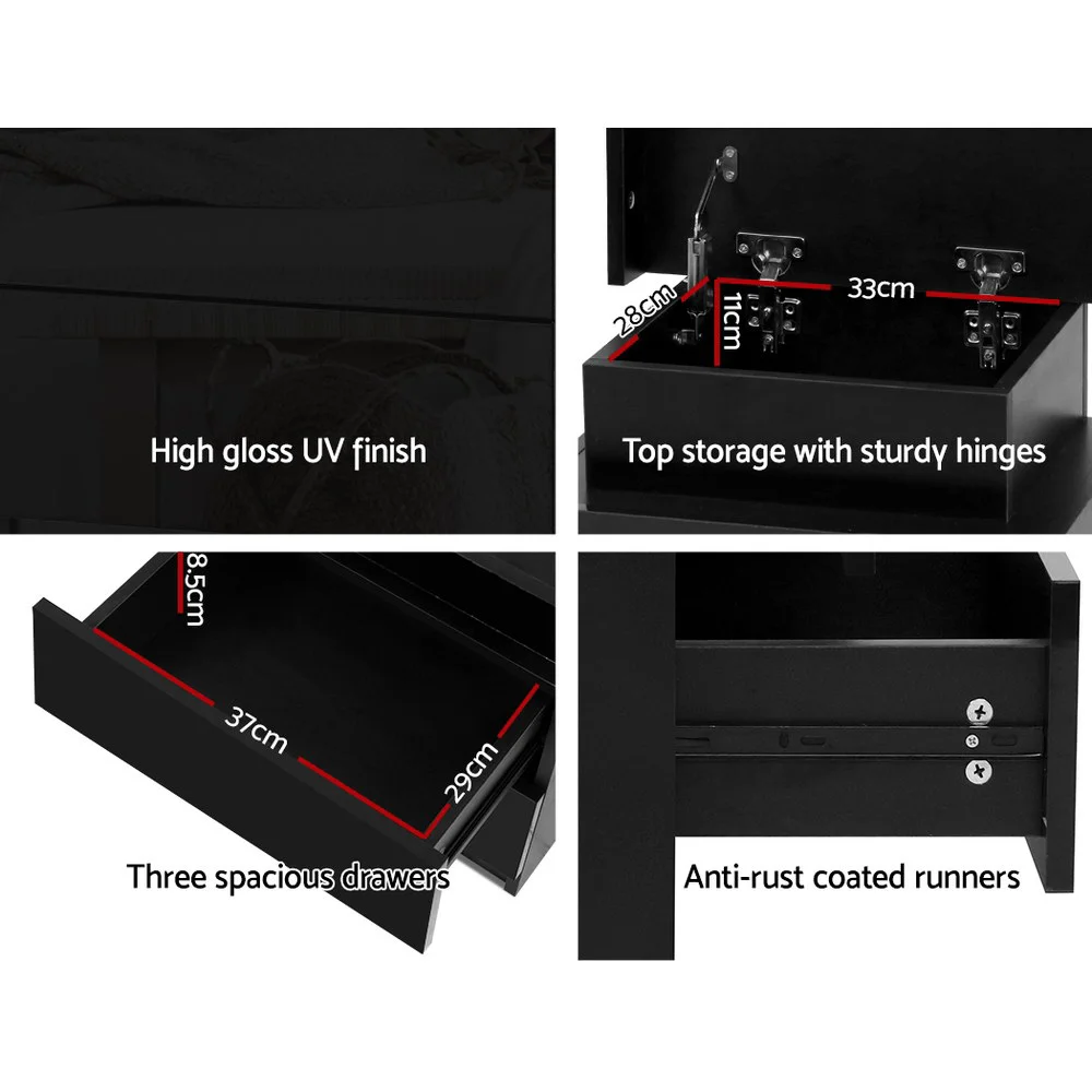 Illuminate your nights with the Artiss Bedside Table LED 3 Drawers - COLEY Black. This modern marvel features customisable LED lighting in 16 vibrant colours, eliminating the need for extra lamps. It boasts three spacious drawers and a lift-up top compartment for ample storage. Made from durable 15mm thick melamine particle board with a high gloss UV finish, it offers a sleek, handle-free design. Perfect for any contemporary space, it's easy to assemble and maintain, making it a standout addition to your home.