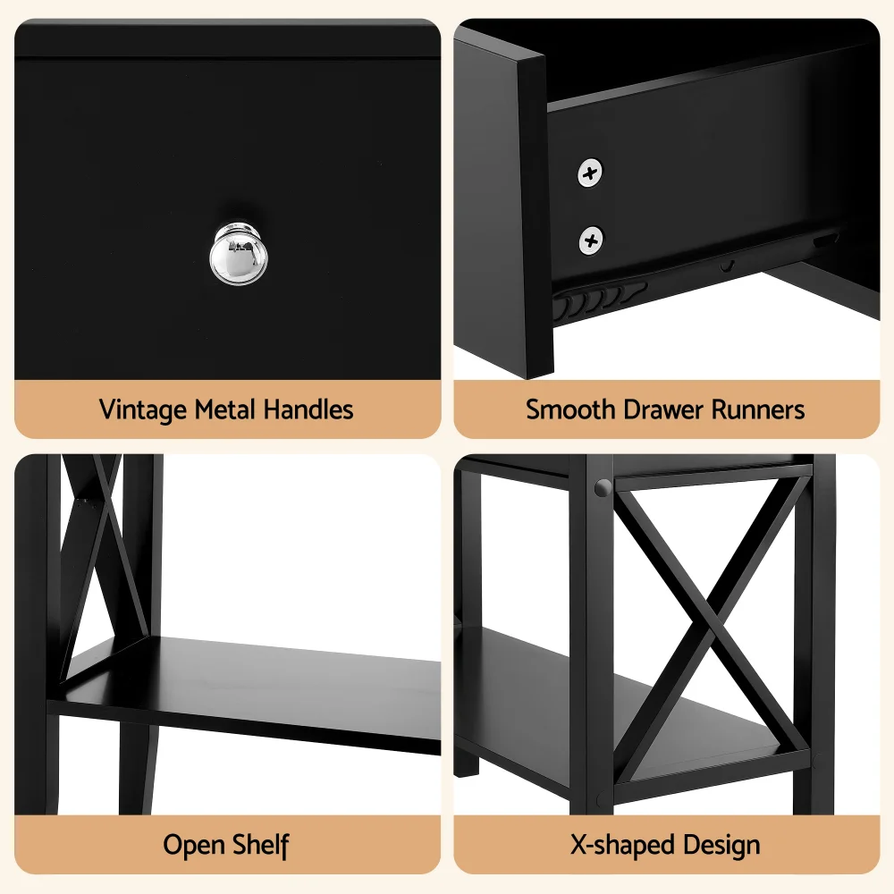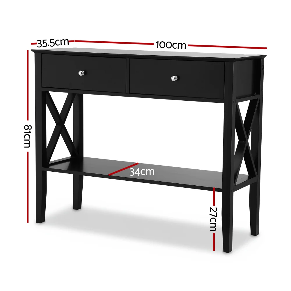 Enhance your home with the sleek and functional Artiss Console Table 2 Drawers 100CM in Black. This versatile piece brings stylish charm and modern utility to any setting, from entryways to living rooms, cafés, or salons. Crafted from high-quality E1 MDF with a sophisticated NC paint finish, it features two spacious drawers with vintage metal handles and smooth runners for effortless access. The 2-tier open shelf offers ample storage, while the anti-toppling device ensures safety. Designed for easy cleaning and maintenance, this console table is as practical as it is elegant.