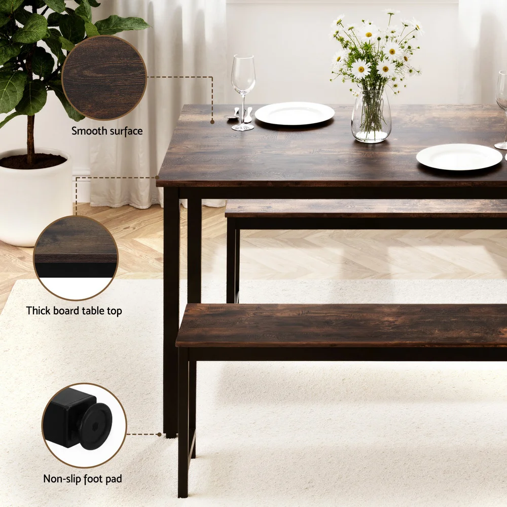 Artiss 3-Piece Dining Set: Dark Walnut Table & Benches with Metal Frame, Compact Space-Saving Design, Easy Assembly