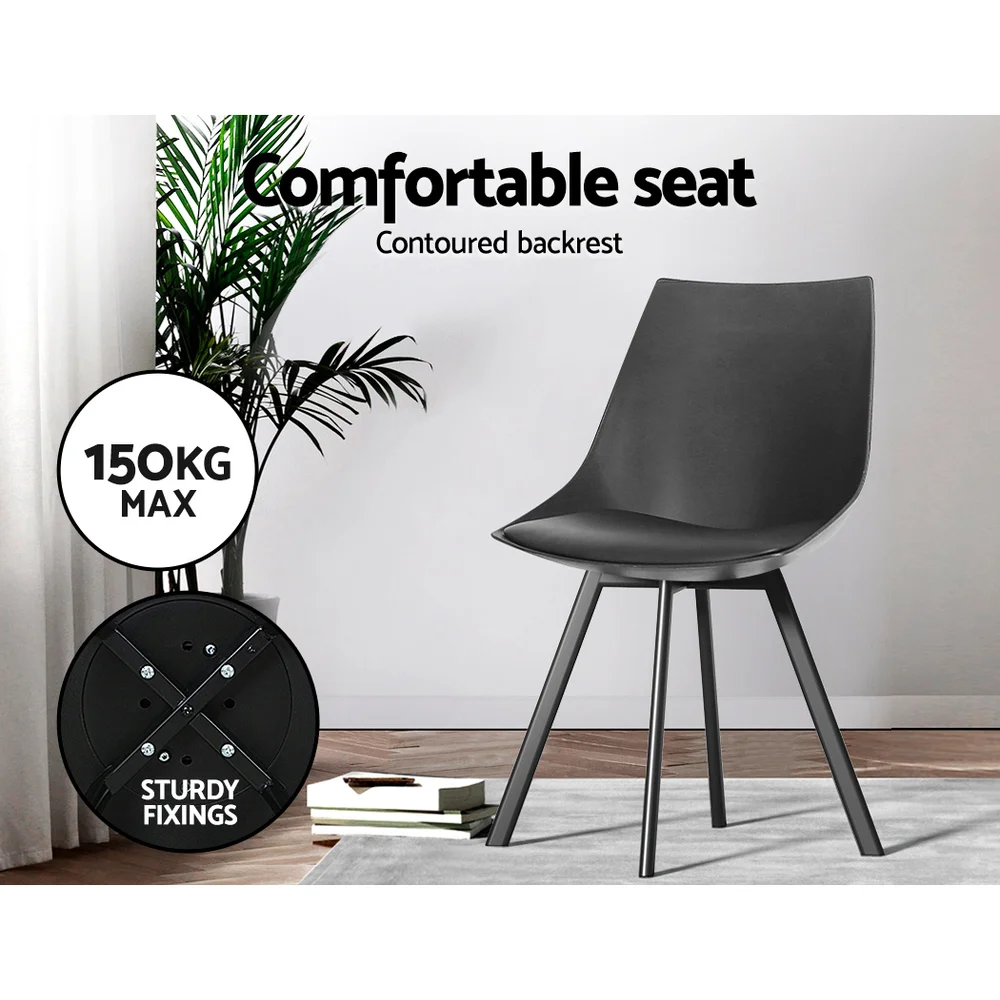 Elevate your dining experience with the Artiss Dining Chairs Set of 2. Designed for comfort and style, these chairs feature plush cushioned seats and back support, sleek PP construction, and sturdy steel legs with anti-slip feet pads for stability and floor protection. With an ultra-modern look in classic black, they seamlessly blend into your dining, study, or living space. Boasting a 150kg weight capacity and easy assembly, these chairs are the perfect blend of elegance, durability, and versatility.