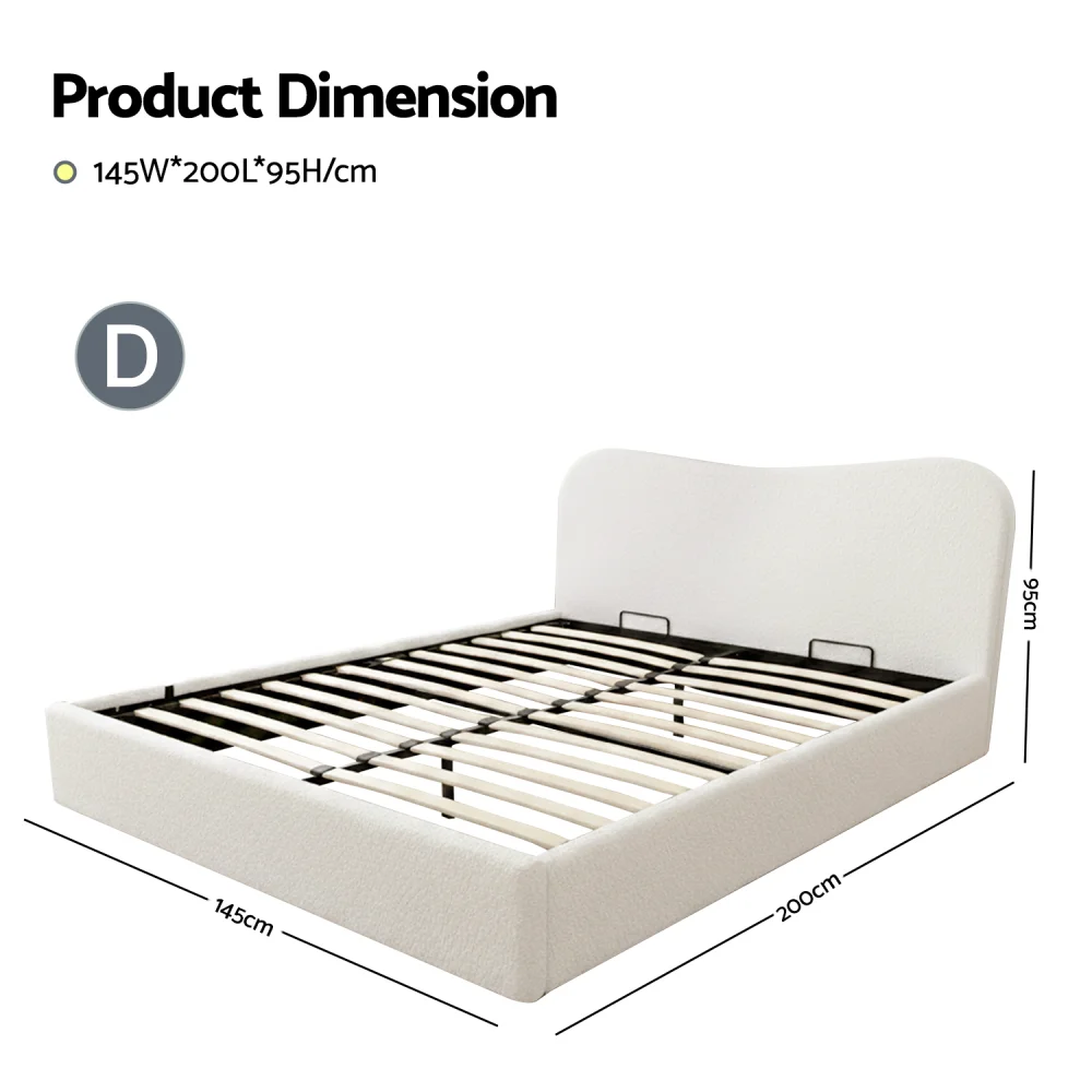 Artiss Double Bed Frame with Gaslift Storage, Bouclé Upholstered, Pine Wood Platform, Beige White, 300kg Capacity