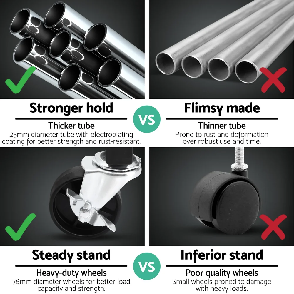 Effortlessly organise your wardrobe with the Artiss Clothes Rack Double Rod Airer Rail Coat Stand. Crafted from heavy-duty, corrosion-resistant metal with a stylish silver and black finish, this rack features adjustable horizontal rods for versatile storage, smooth 360° swivel casters with two lockable wheels, and anti-slip stoppers. Protective plastic caps prevent wall damage, and the rack collapses for easy storage, perfect for homes, rentals, or retail spaces.