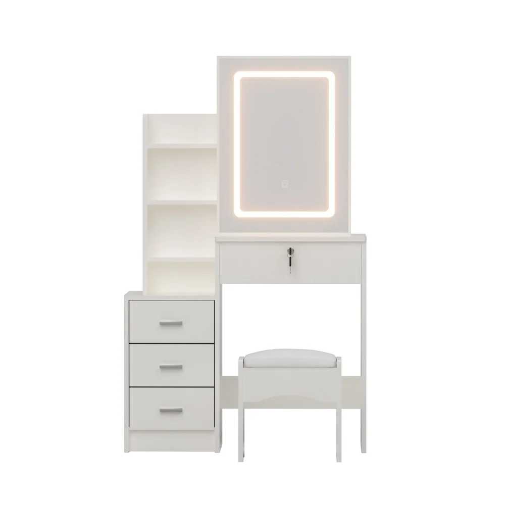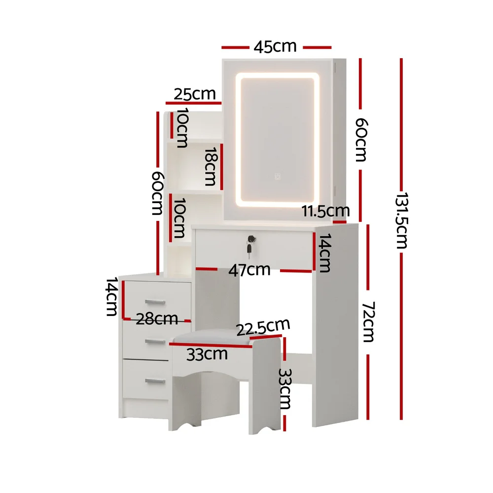 The Artiss LED Dressing Table Vanity Desk Set in elegant white is a stylish fusion of functionality and modern design. Featuring a sliding mirror door with hidden storage and three adjustable LED lighting options, it ensures perfect illumination for flawless makeup application. With four spacious drawers, including one lockable, you can keep your beauty essentials neatly organised. The foam-padded stool guarantees comfort, while the durable, easy-to-clean design ensures lasting quality. Perfect for bedrooms, apartments, or professional settings, this vanity is a beauty enthusiast's dream. Warning: Always secure furniture with an anchor device to prevent tip-over accidents.
