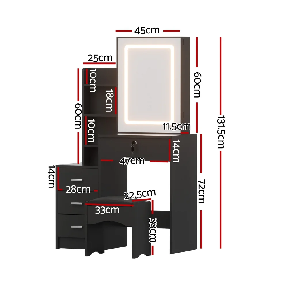 Artiss LED Dressing Table Vanity Set Black, Sliding Mirror, 4 Drawers, Lockable, Padded Stool, 80x36x131cm