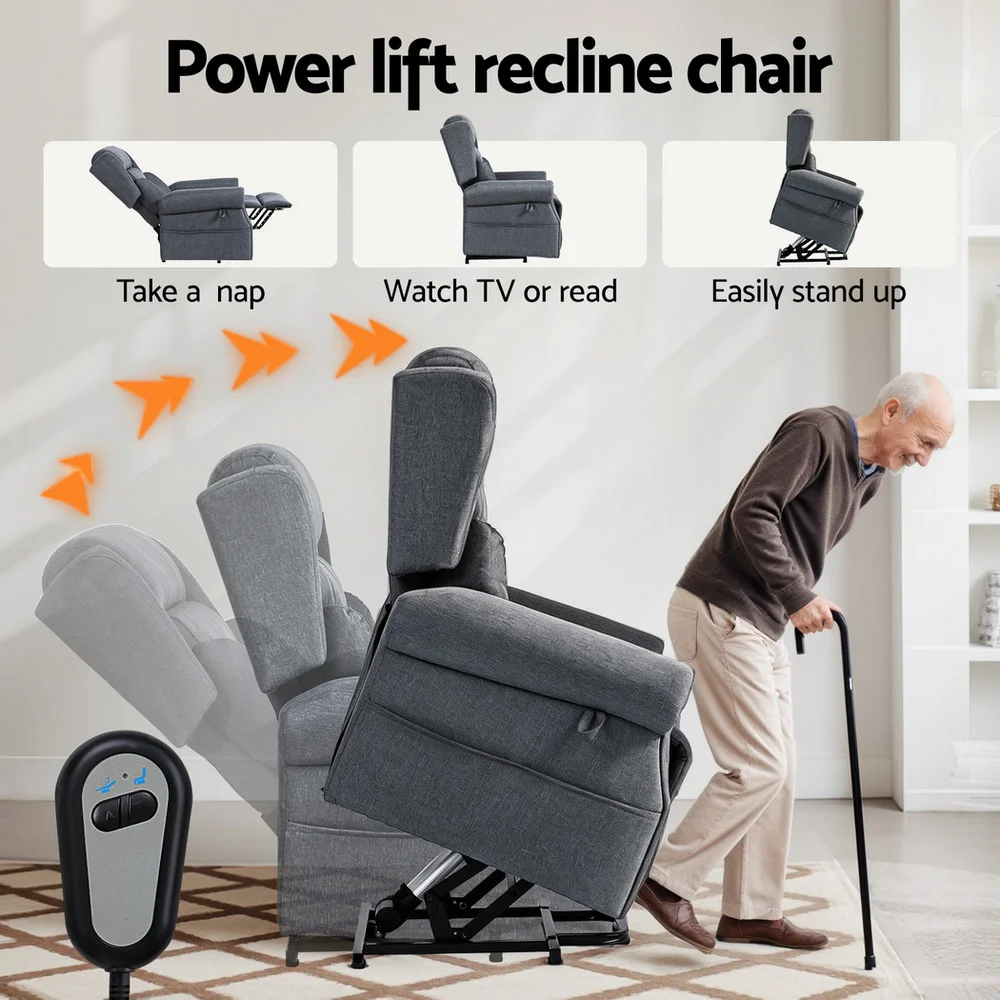 Discover unparalleled comfort with the Artiss Electric Recliner Chair Power Lift Massage Heated Recliner Sofa. Designed for ultimate relaxation, this chair features smooth lift assistance for effortless rising, making it ideal as a nursing chair or post-surgery recovery aid. Perfect for compact spaces, it measures 86-98-107 cm, fitting seamlessly into any room. Enjoy personalised relaxation with 8 massage nodes and lumbar heating to enhance blood circulation. Crafted with skin-friendly fabric, high-density foam, and a robust wood frame supporting up to 150 kg, this recliner promises durability and comfort. Assembly is quick and tool-free, ensuring you can lounge in luxury within minutes.