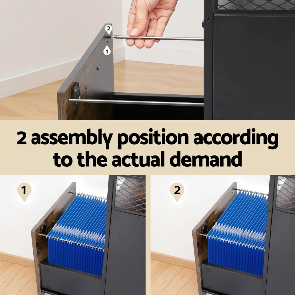 Enhance your office organisation with the Artiss Filing Cabinet, a perfect blend of style and functionality. Its rustic wood finish exudes charm, while smooth-rolling lockable wheels offer mobility and stability. Featuring two secure locking drawers, this cabinet ensures your files are safe and organised. The 75kg-capacity top shelf provides additional space for office essentials. Adjustable hanging folders accommodate A4 and letter file sizes, and matte black handles add a modern touch. Built with a sturdy steel frame, this cabinet is designed to last, making it an ideal choice for both home and office environments. Please follow safety warnings to prevent tip-overs.