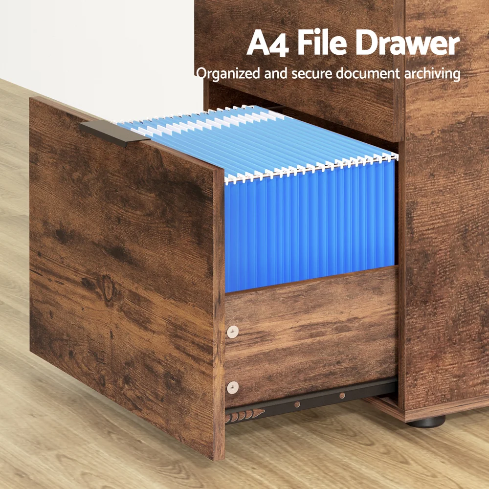 Enhance the functionality and style of your home office with the Artiss Filing Cabinet. Featuring a rustic brown finish, this cabinet combines form and function with its durable E1 particle board construction and MB foil lamination. Designed to accommodate your A4 documents, it includes a spacious drawer with a metal rod for hanging suspension files. The sleek design, accented by stylish black metal lip handles, seamlessly fits into any decor. With anti-rust metal drawer runners, accessing your essentials is smooth and effortless. Safety is paramount, so always secure with an anchor device. Perfect for professionals and home users, this cabinet is a reliable storage solution.