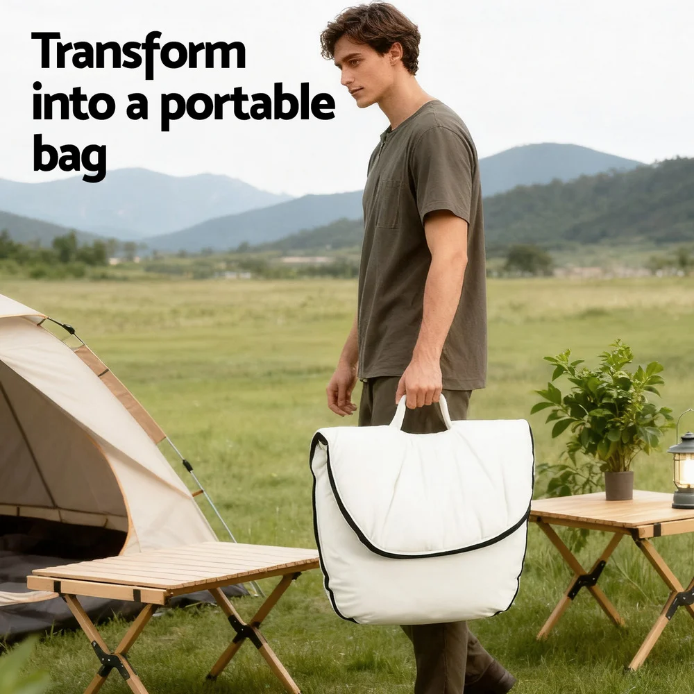 Experience ultimate flexibility with the Artiss Foldable Chair 2-In-1 Armchair Lounge Chair in a sleek white finish. This innovative design effortlessly transitions from a comfortable armchair to a compact tote bag, making it the perfect companion for picnics, festivals, or camping adventures. Upholstered in durable, cat-scratch-resistant leather, it wipes clean in seconds and is filled with plush cotton and sponge for exceptional comfort. With a sturdy metal frame and a weight capacity of 100kg, it offers reliable support without needing assembly, adding a touch of elegance and practicality to any living space.