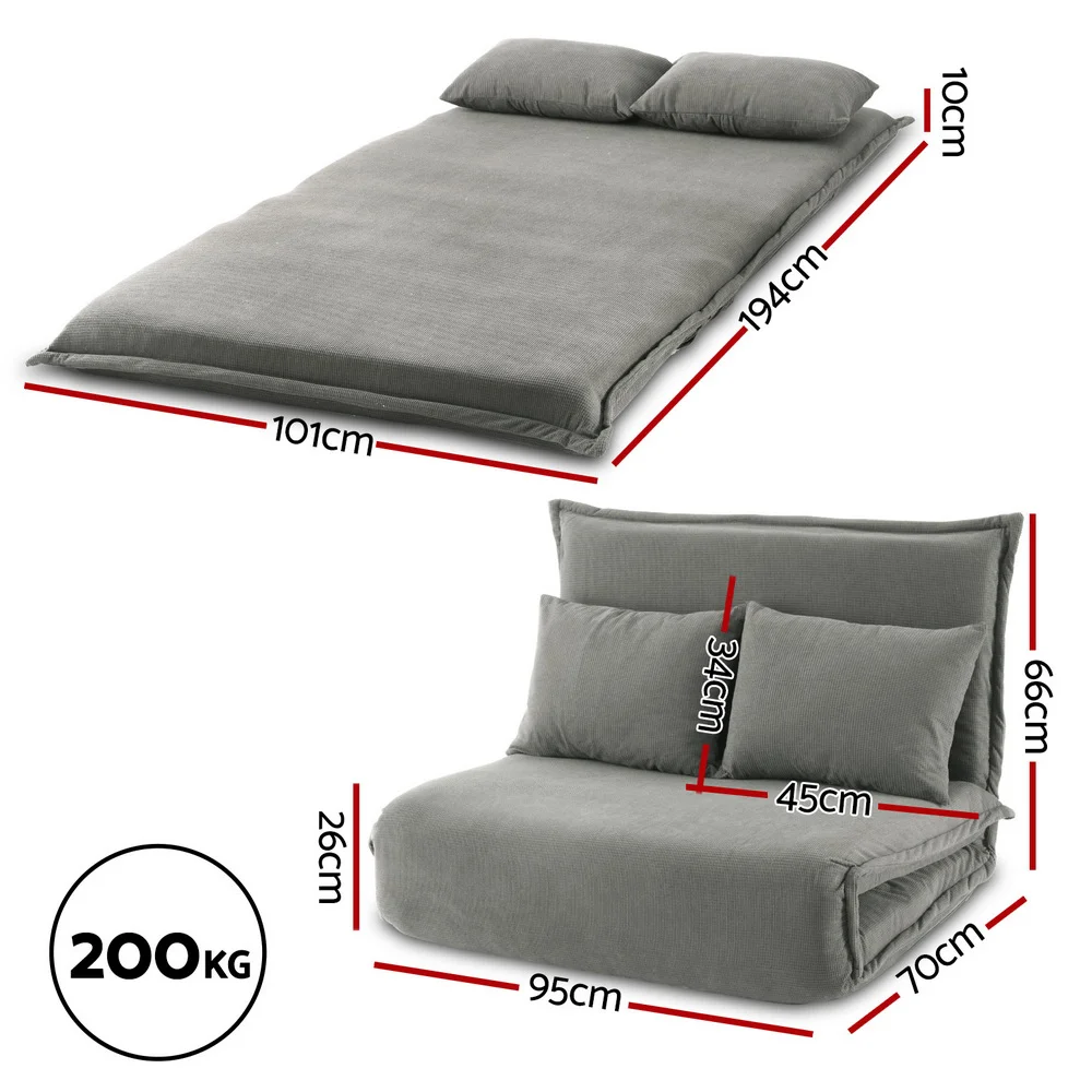 Artiss Foldable 2-Seater Floor Lounge Sofa Bed, Grey Corduroy, Adjustable 6-Level Back & Leg Support, Compact Design