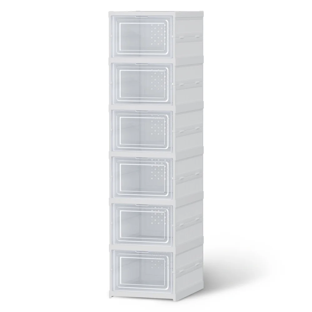 Transform your space with the Artiss Foldable Shoe Rack Organiser, a stylish solution for cluttered entryways, cloakrooms, or garages. This 6-tier storage shelf, crafted from durable PP plastic, features a smart foldable design with a one-piece frame for hassle-free setup. The breathable back flap and see-through doors with raised handles ensure easy access while maintaining a sleek appearance. With each compartment supporting up to 2.5KG, this shoe rack offers practical storage without compromising on style. Its compact dimensions (26x34.5x105cm) make it perfect for smaller homes. White finish. Assembly required.
