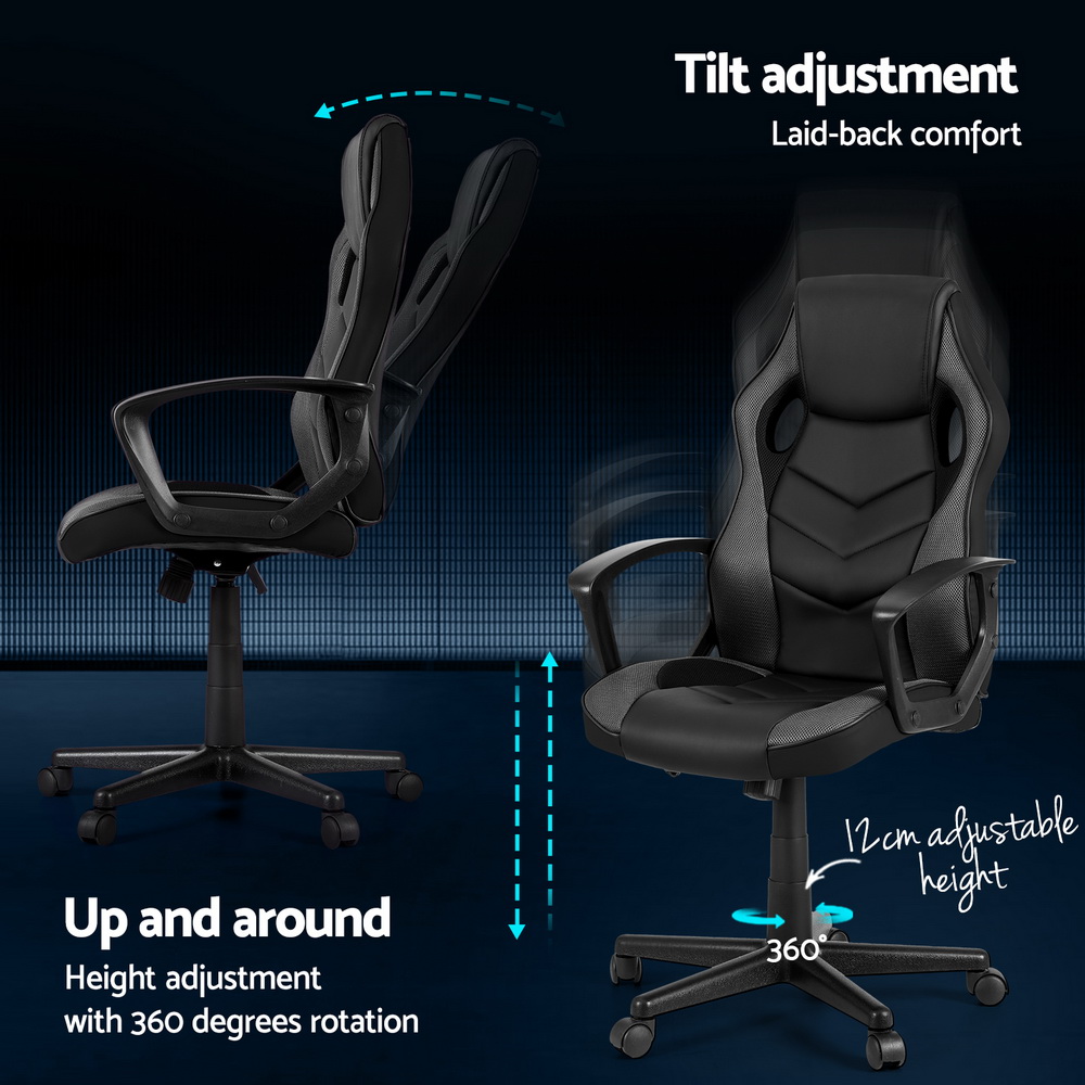 Experience ultimate comfort and style with the Artiss Gaming Office Chair in sleek grey. Perfect for gamers and execs, it boasts premium PU leather and breathable mesh upholstery. Enjoy plush seating with high-density sponge padding and a sturdy plywood frame. Inspired by racing car seats, it features a high-back design and ventilation holes. With 360-degree swivel, height adjustment, and tilt function, it's designed for peak performance. Cruise smoothly on its nylon base with five castor wheels. Backed by a 1-year warranty.