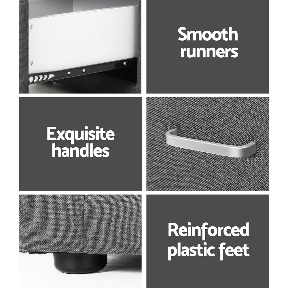 Elevate your bedroom aesthetic with the Artiss CADEN Grey Bedside Table. Crafted with elegant linen fabric, this modern piece offers practicality and style. Featuring two spacious drawers, it's perfect for storing personal essentials while providing a spot for a lamp or your morning cup of coffee. The sturdy MDF frame, complemented by contemporary aluminium handles and anti-rust metal draw runners, ensures durability and sleek design. Whether as a bedside or side table, it's the epitome of versatile sophistication. Easy to assemble and backed by a 1-year warranty, it's a must-have for any home.