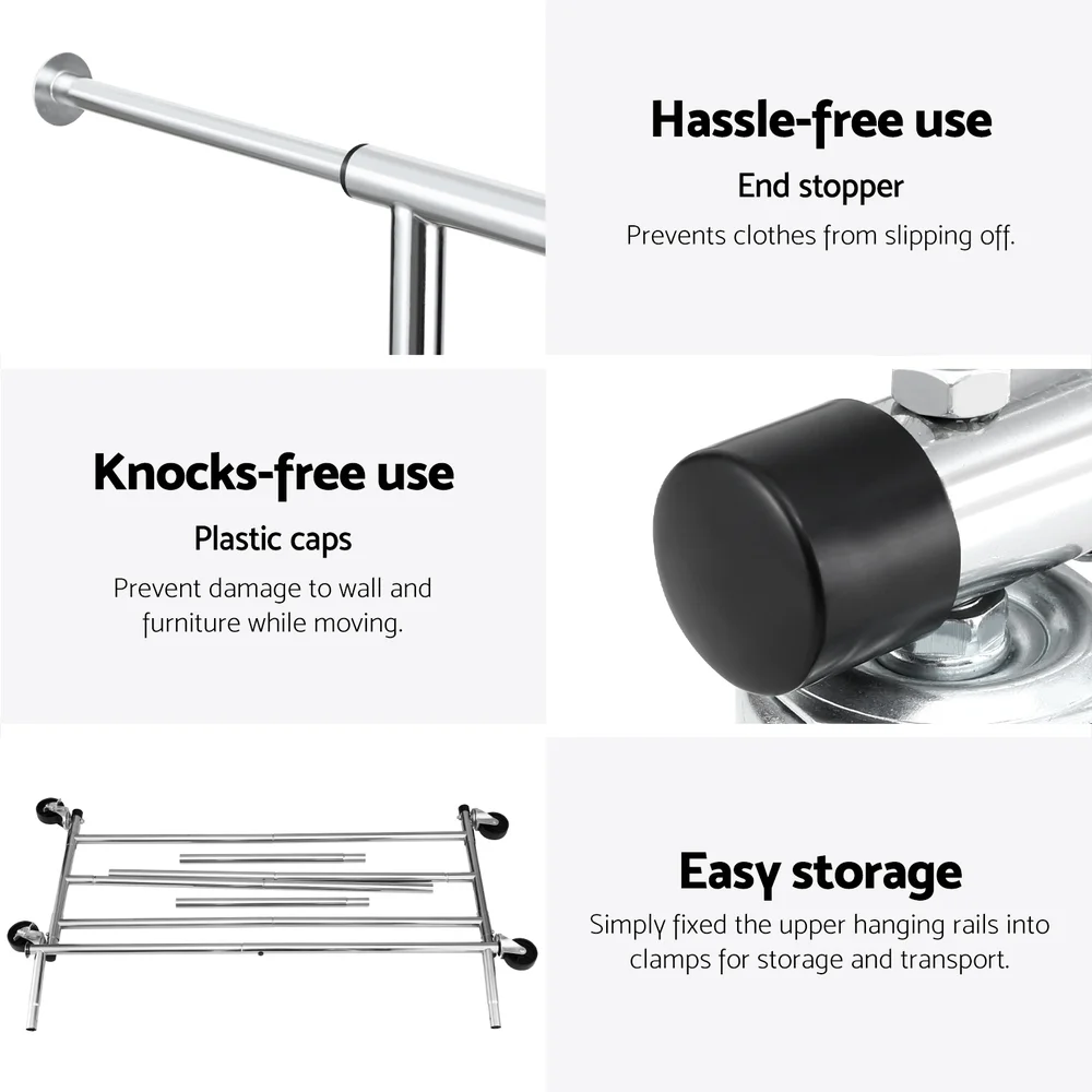Organise outfits effortlessly with the Artiss Heavy-Duty Clothes Rack, combining industrial strength with smart design. The corrosion-resistant metal frame ensures long-lasting support for coats, dresses, or other items. Glide smoothly across floors with 360° swivel casters, and two lockable wheels keep the rack stationary when needed. Adjust the horizontal rod length to accommodate different clothing sizes, while protective plastic caps shield walls from scratches. Collapse the rack vertically for under-bed or cupboard storage. Perfect for rental spaces, retail displays, or daily home use!