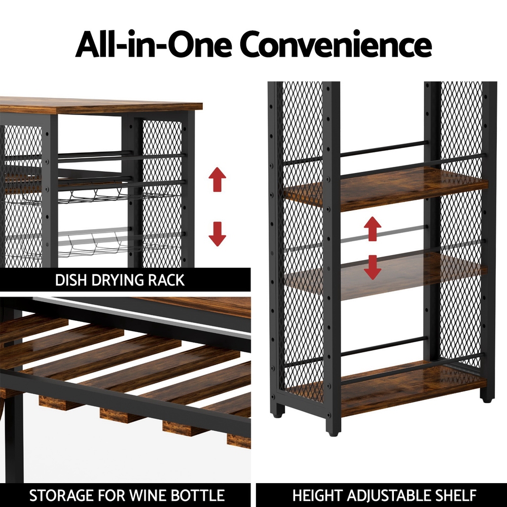 Artiss Industrial Bar Table 122cm Walnut with Wine Rack, Cup Holders, Multi-Level Storage, Metal Frame, MDF Top
