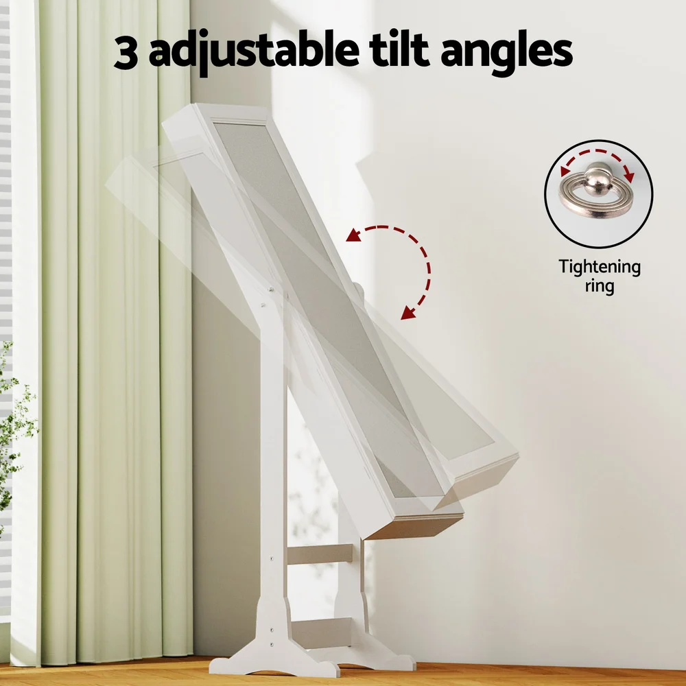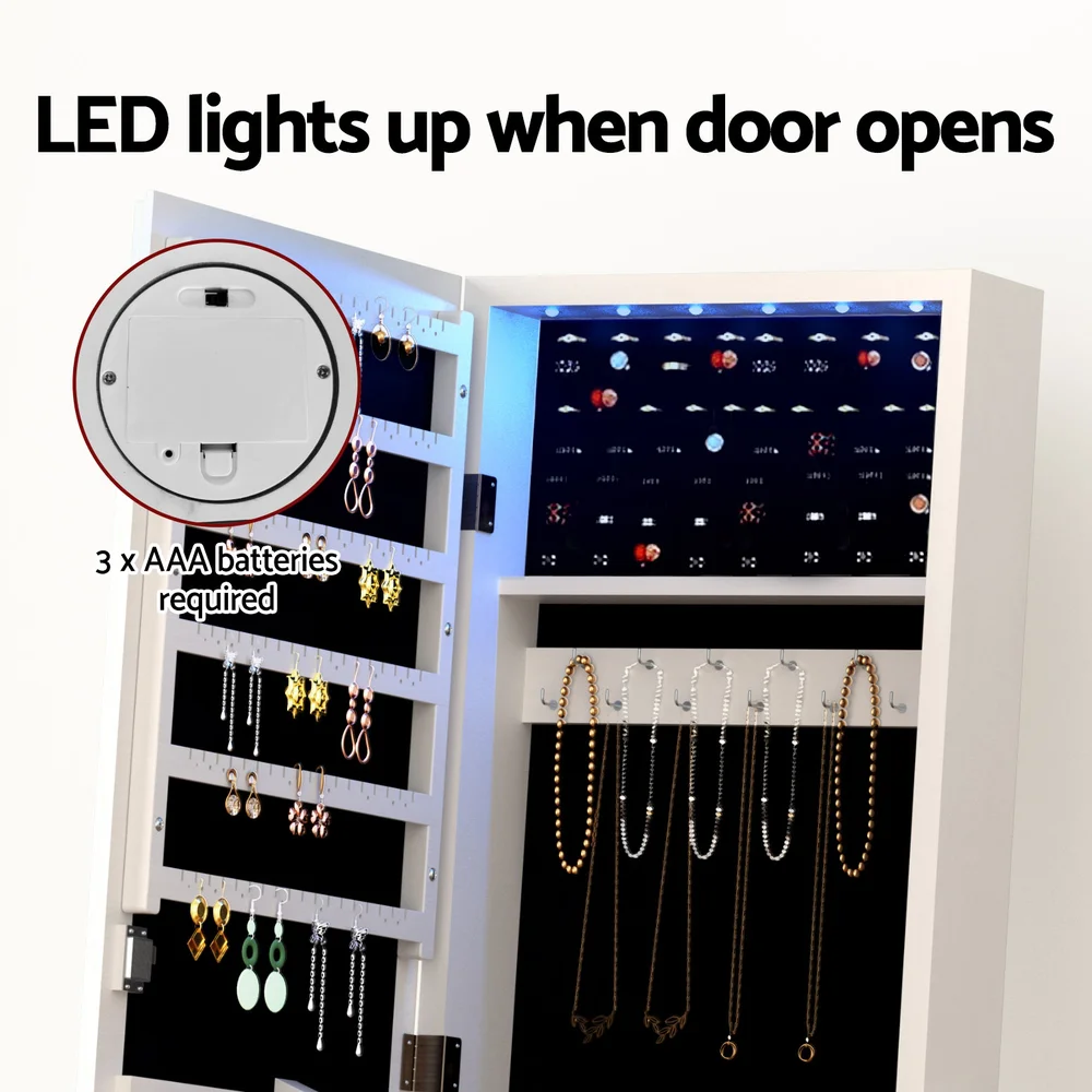 Elevate your jewellery organisation with the Artiss Jewellery Cabinet Mirror Free Standing. This elegant piece combines functionality with style, featuring a full-length mirror and a lockable cabinet crafted from robust MDF. Inside, you'll find ample storage space, a soft flocking lining, and LED lighting to showcase your collection. Easy to assemble and available in classic white or black, this cabinet is the perfect addition to any room. Requires 3 AAA batteries (not included). Comes with a 1-year warranty.