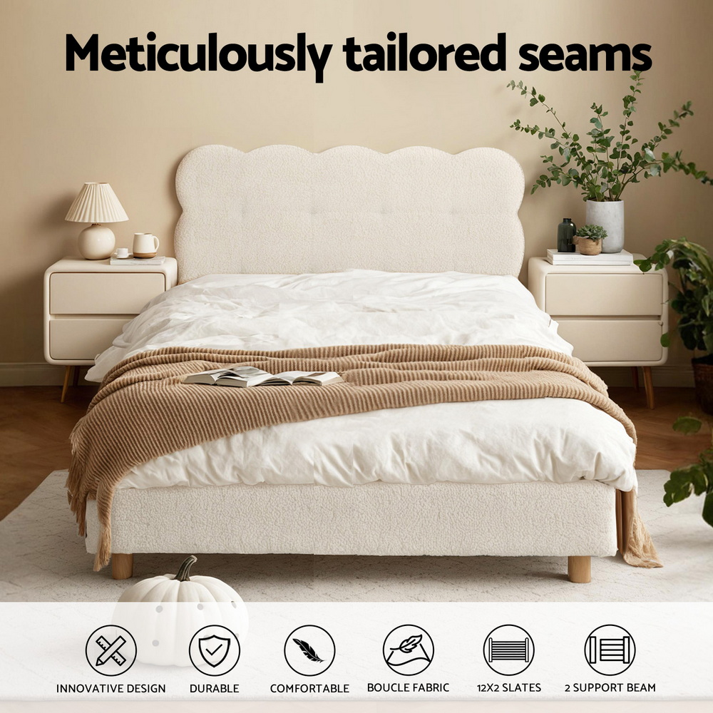 Artiss King Single Bed Frame Cloud Headboard White Bouclé Fabric, Wood and Metal Platform Base, 300KG Capacity