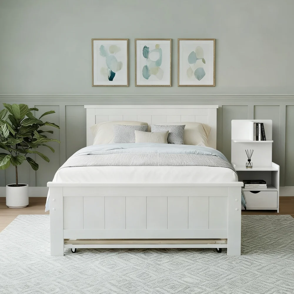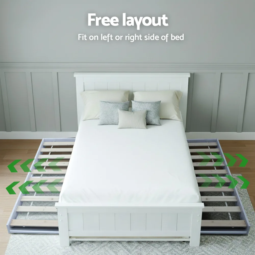 Artiss King Single Trundle Bed Frame & Bedside Table Set - Solid Pine Wood, White Finish, Space-Saving with Storage