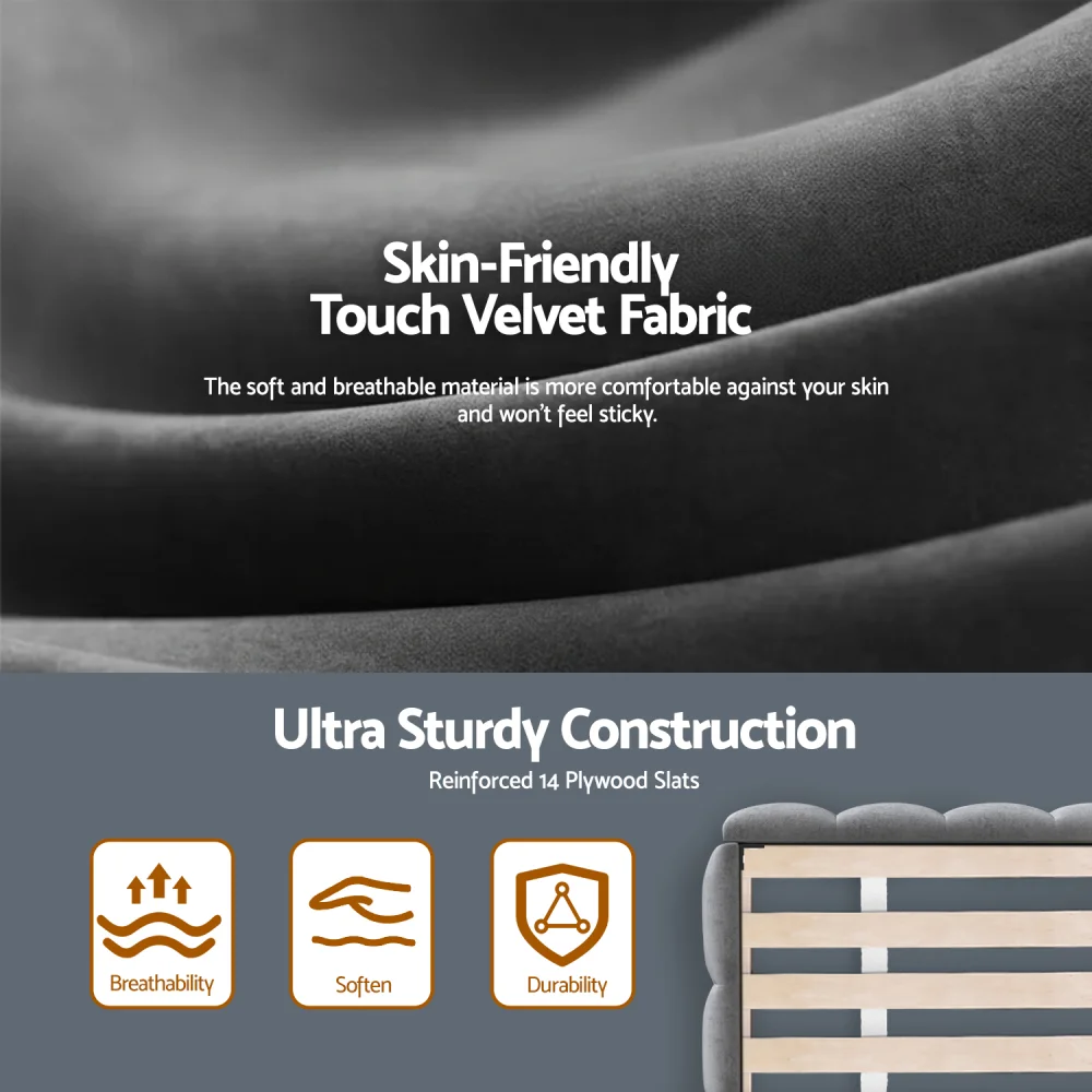 Elevate your bedroom with the Artiss King Size Bed Frame, where elegance meets functionality. The standout feature is its plush, cloud-inspired velvet headboard that adds a touch of luxury, while the modern platform base ensures a sleek, contemporary look. Crafted from a reinforced plywood-pine wood frame, this bed offers robust support with 14 durable slats and high-quality metal fixings, holding up to 300kg. The smooth-edge velvet upholstery not only enhances elegance but also ensures safety. Designed to fit standard king mattresses, assembly is a breeze, making this the ultimate bedroom upgrade.