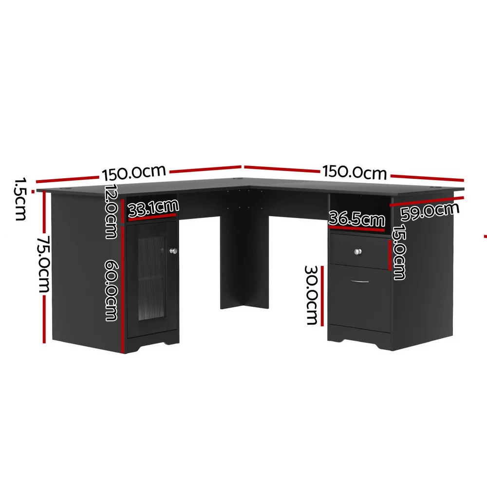 Artiss L-Shaped Computer Desk, 15mm Particle Board, 150x150cm, Black - Corner Table with Storage, Cable Management