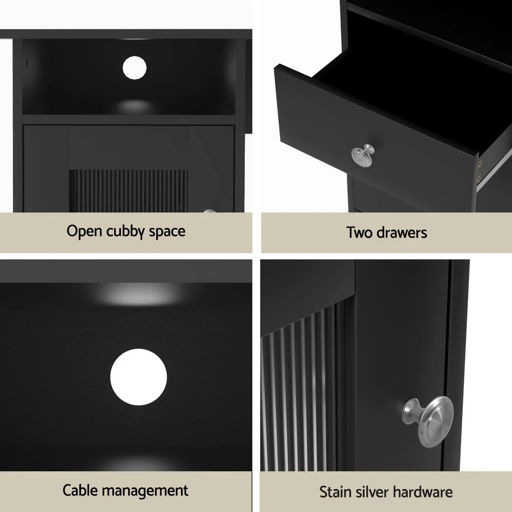Elevate your home office or study space with the Artiss L-shaped Computer Desk, a perfect blend of sophistication and functionality. Crafted from 15mm thick particle board with a melamine finish, this desk is designed to withstand robust use. Its L-shaped design fits neatly in corners, optimizing space. With a wide desktop, two spacious drawers, an open cubby, and a storage cabinet, it accommodates all your work essentials. Enjoy features like safe edges, cable management holes, and an anti-slip base. Transform your workspace with this practical, easy-to-assemble desk.
