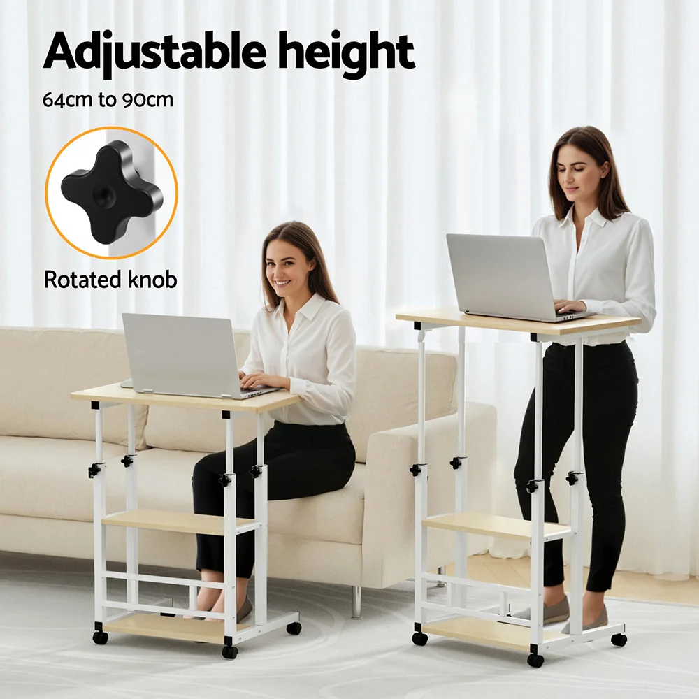 Artiss Adjustable Mobile Laptop Desk – 60CM, Steel Frame, Dual-Knob Height, 2-Tier Storage, Lockable Wheels, Oak/White