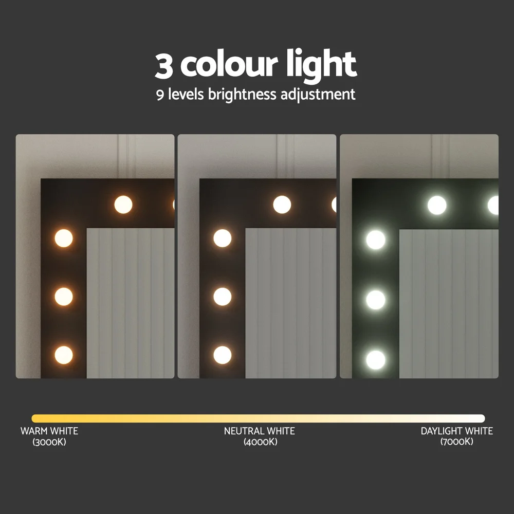 Elevate your beauty routine with the Artiss Dressing Table Set in sleek black. Channelling Hollywood glamour, this LED vanity table features a mirror surrounded by 12 adjustable LED bulbs offering three-colour options—neutral white, warm white, and daylight white—for impeccable makeup application. With four spacious drawers, organising your beauty essentials is effortless. The set includes a comfortable, soft padded stool upholstered in PU leather. Constructed from durable particle board with a melamine finish, it's easy to clean and maintain. Safety is paramount; secure it with an anchor device. Perfect for a touch of elegance in your daily routine.