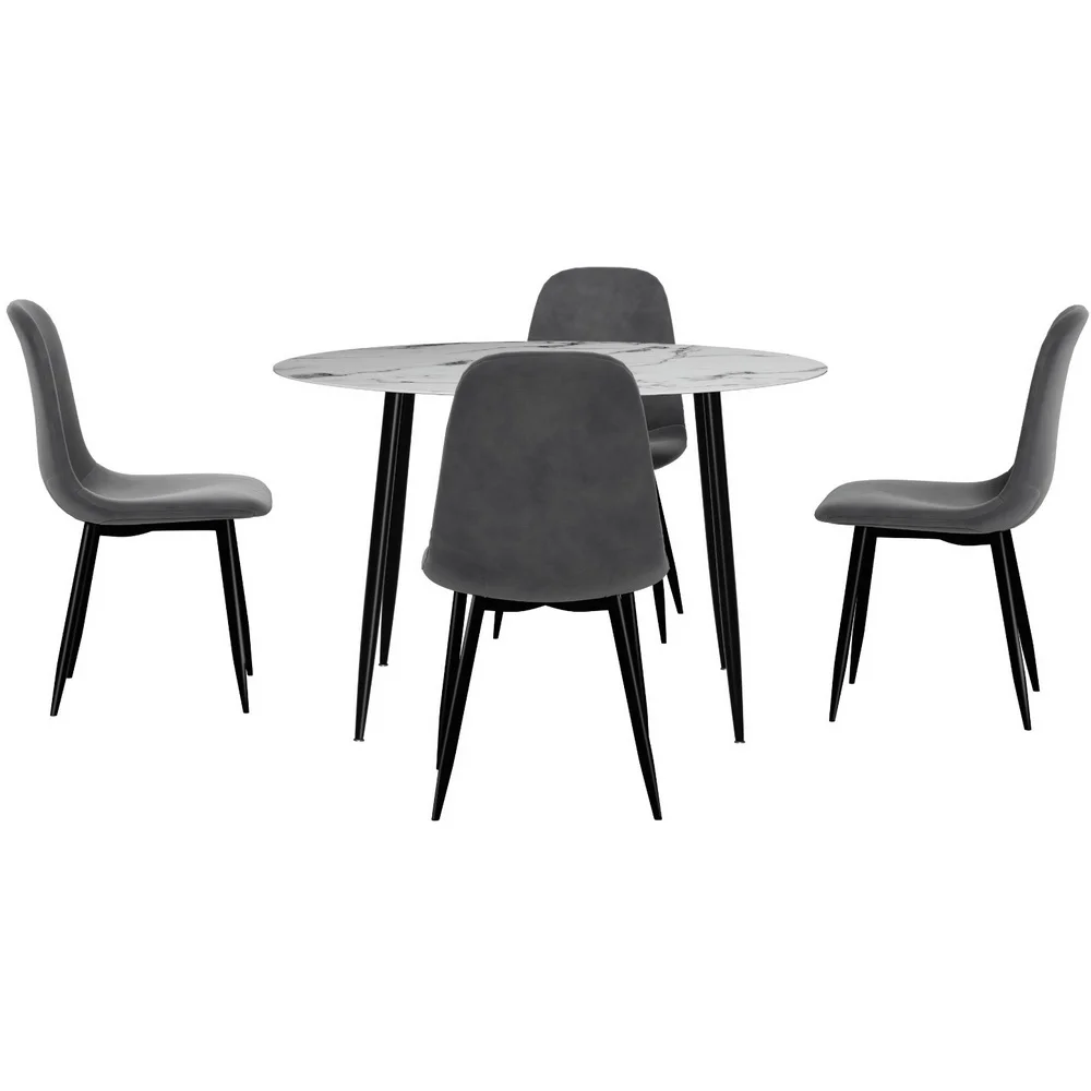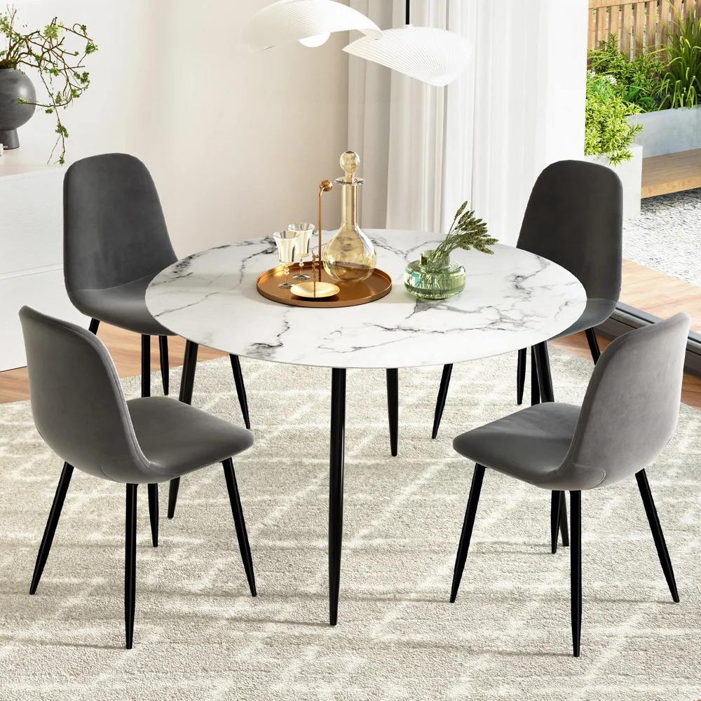 Artiss 5-Piece Dining Set, Round Marble Finish Table 110cm with 4 Velvet Grey Chairs, Metal Legs, Modern Style