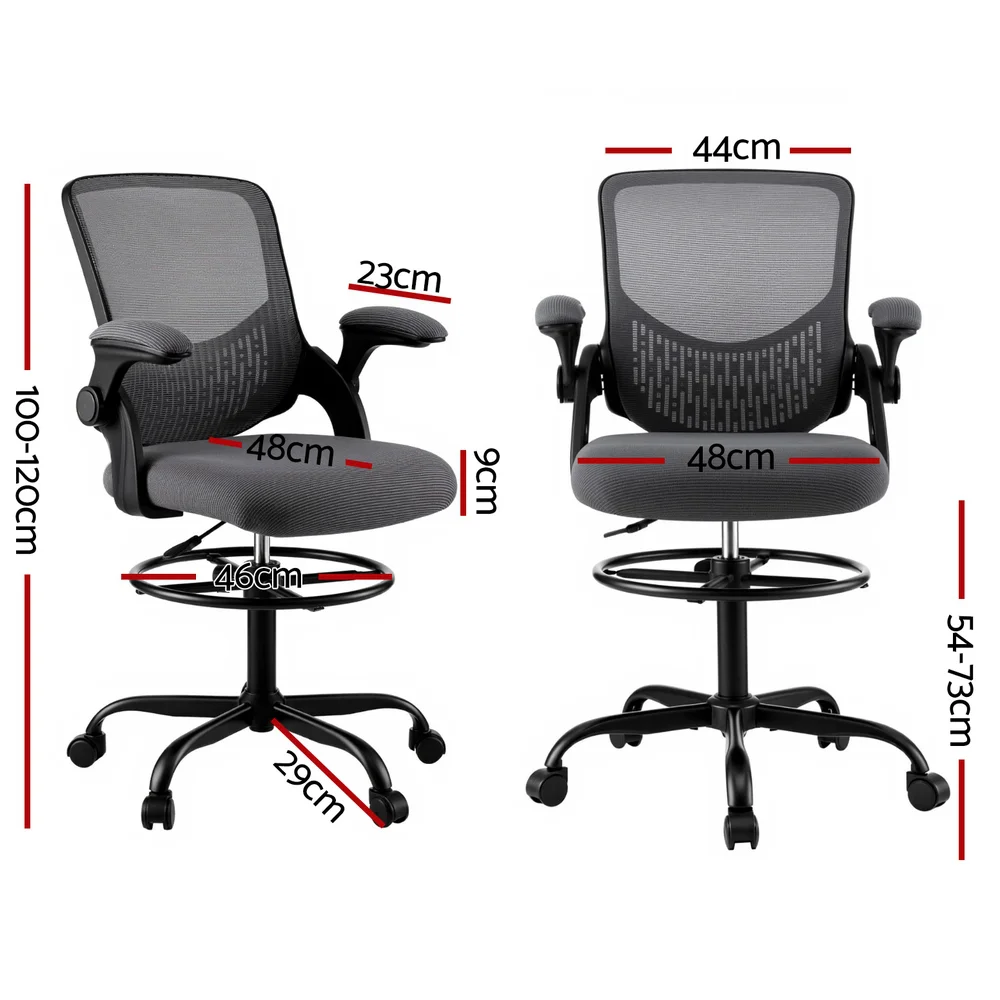 Upgrade your workspace with the Artiss Mesh Drafting Office Chair. Designed for comfort and style, it features a breathable mesh backrest, contoured support, flip-up armrests, and a height-adjustable seat and footrest ring for personalised use. The 360-degree swivel and stylish chromed base add modern flair, making it ideal for home or office studios. With a sturdy build and 150kg capacity, this chair adapts seamlessly to your needs and comes with a 1-year warranty.
