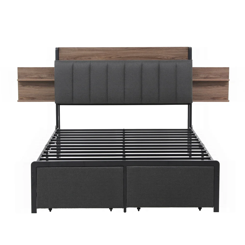 Artiss Double Size Metal Bed Frame with 2-Tier Storage & Charging Station, Grey Faux Linen, Steel Slats, 300kg Capacity