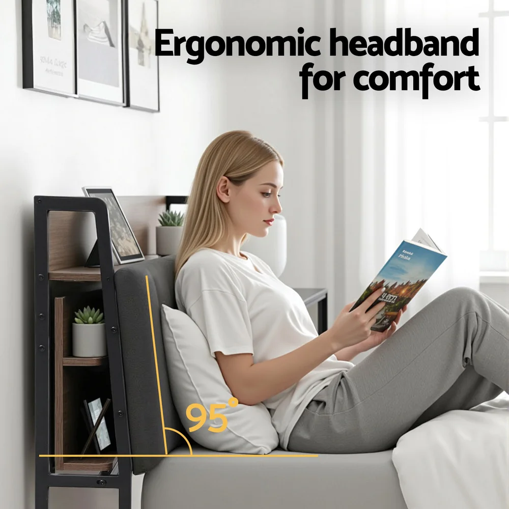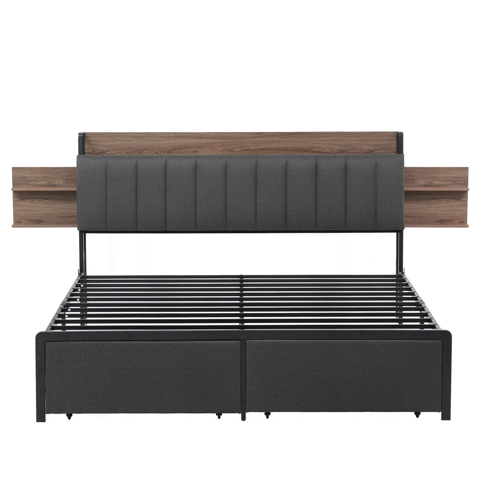 Artiss King Size Metal Bed Frame with 2-Tier Storage & Charging Station, Faux Linen Upholstery, Steel Slats, Oak/Grey
