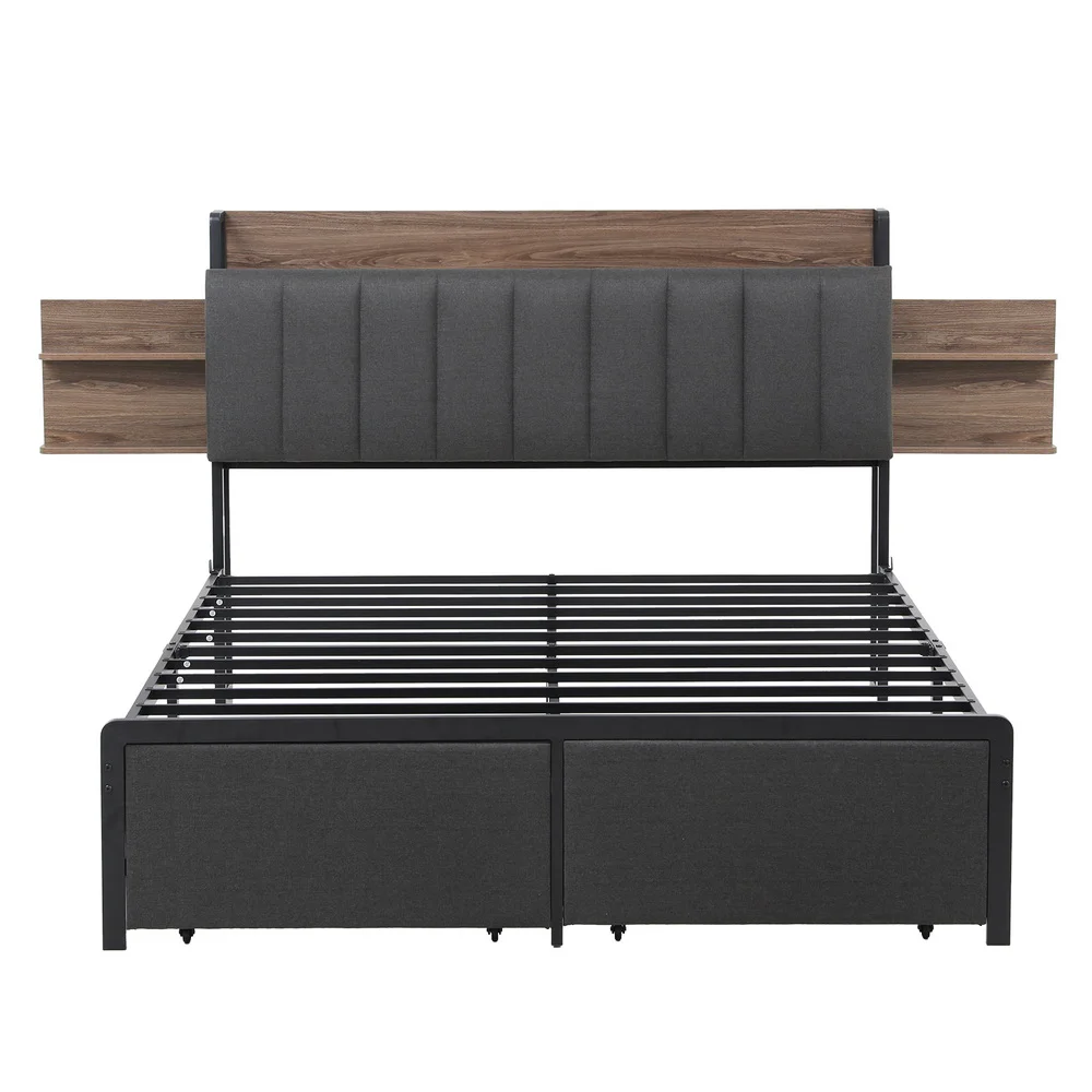 Artiss Queen Metal Bed Frame, Grey Faux Linen, with 2-Tier Hidden Storage, Charging Station, & Padded Headboard