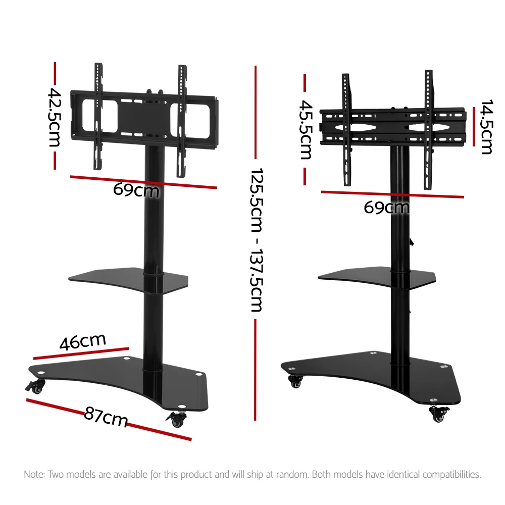 Transform your entertainment space with the Artiss Mobile TV Stand, designed to accommodate 32" to 70" TVs. This sleek, black powder-coated stand integrates your TV and multimedia equipment into a seamless ensemble. Featuring a sturdy 2-tier tempered glass shelf, it supports up to 20kg on the bottom tiers and 40kg on the top tier. Built with robust 50mm diameter metal tubes, it ensures durability and stability. The stand boasts flexible VESA mounting options, a 35° swivel, adjustable height, and cable management, making it both stylish and functional. Easy to assemble and secure, this stand includes a 1-year warranty for peace of mind.