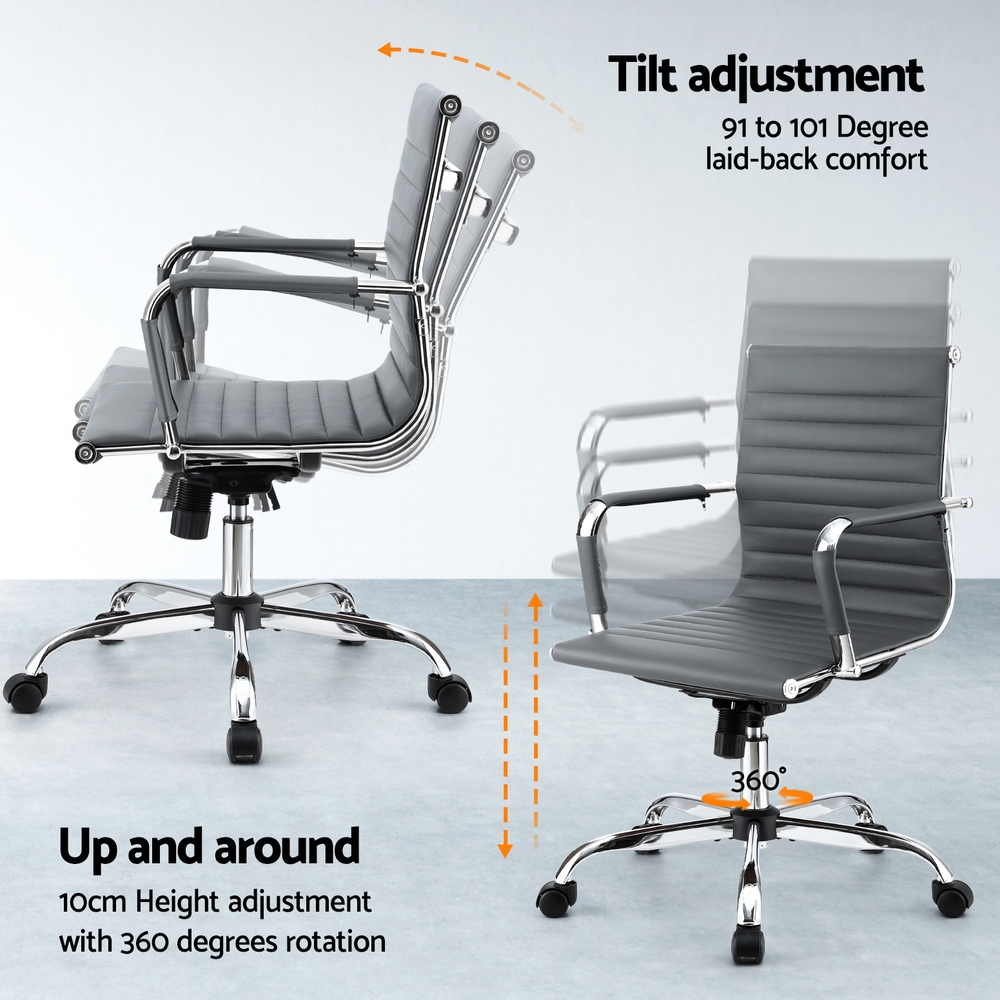Elevate your workspace with the Artiss Office Chair in sophisticated grey. Designed for modern comfort and style, this mid-back chair features smooth PU leather upholstery, a stylish chromed base, and a 360° rotatable seat. Enjoy customised comfort with tilt and 10cm gas lift height adjustment, while the built-in rear rack keeps accessories at hand. Five wheel castors ensure effortless movement, making it perfect for conference rooms or home offices. Assembly required. Includes a 1-year warranty.