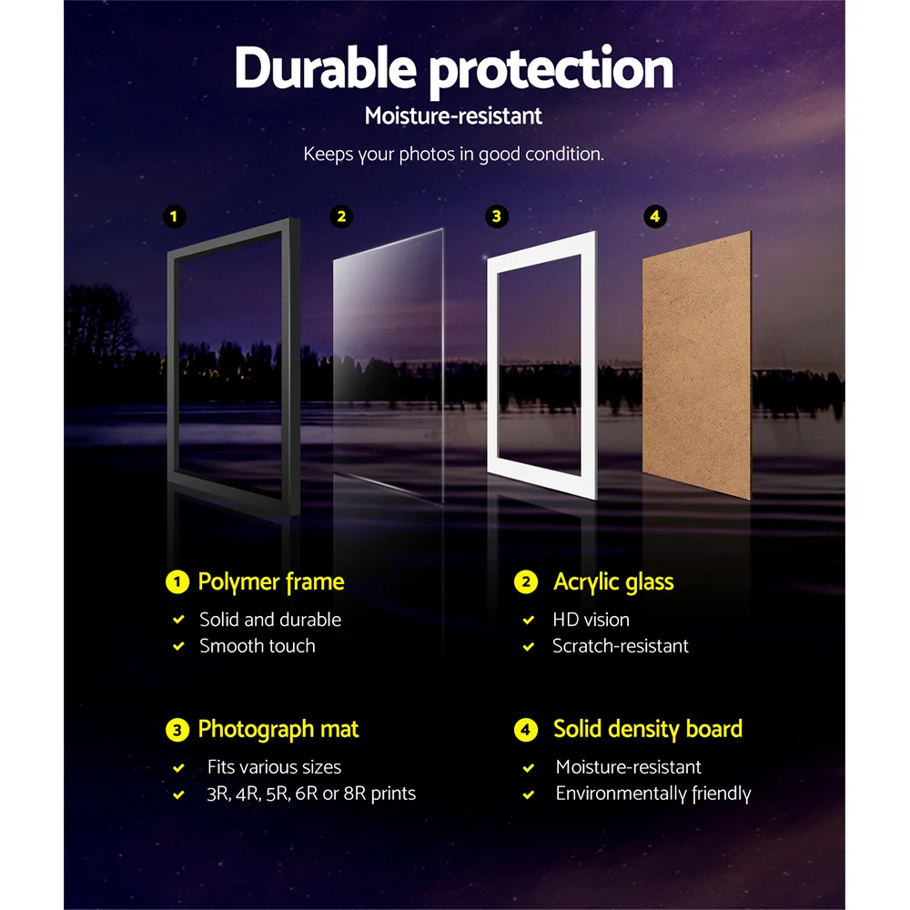Capture life's most precious moments with the Artiss Photo Frames Art Holder Set. This elegant 11-piece frame collection allows you to display your cherished photos in style, turning any wall into a visual storytelling canvas. Designed to fit a range of photo sizes from 3R to 8R, these frames feature a sleek black finish, crafted from durable polymer with polystyrene glass to protect your images. The moisture-resistant hardboard backing ensures longevity, while included hanging accessories make set up a breeze. Whether arranged in portrait or landscape, these frames are sure to become a centrepiece of conversation.