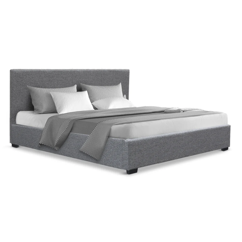 Artiss Nino Queen Size Gas Lift Bed Frame, Grey - Faux Linen Upholstery, Storage, Steel Frame, Padded Headboard