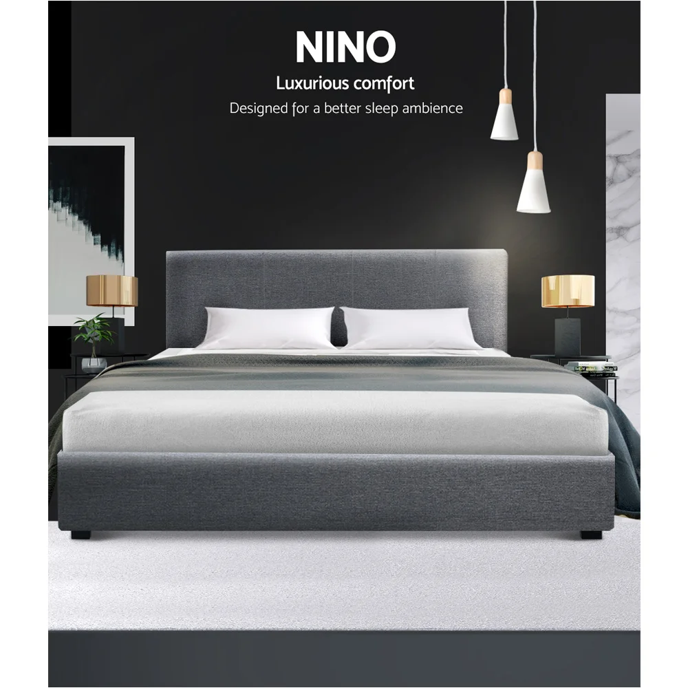 Transform your bedroom with the Artiss Nino Queen Size Gas Lift Bed Frame in Grey, where elegance meets functionality. The bed frame, upholstered in premium faux linen, features a contemporary headboard and is padded with high-density foam for ultimate comfort. Beneath its stylish exterior lies a spacious storage compartment, effortlessly accessible via a smooth gas lift mechanism, perfect for concealing bedding essentials. Built with a sturdy steel frame and reinforced wooden construction, it promises durability and easy assembly. Note: Mattress sold separately.