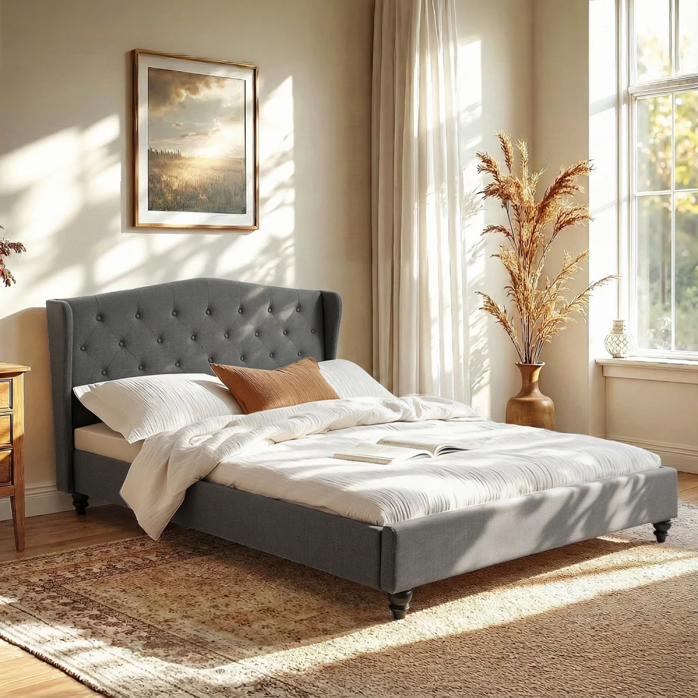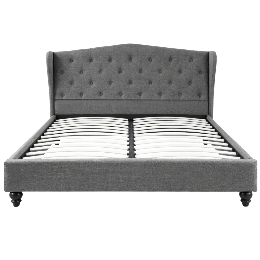 Artiss Queen Bed Frame with Wingback Tufted Headboard, Grey Linen Upholstery, Steel Frame, Fits Standard Queen Mattress
