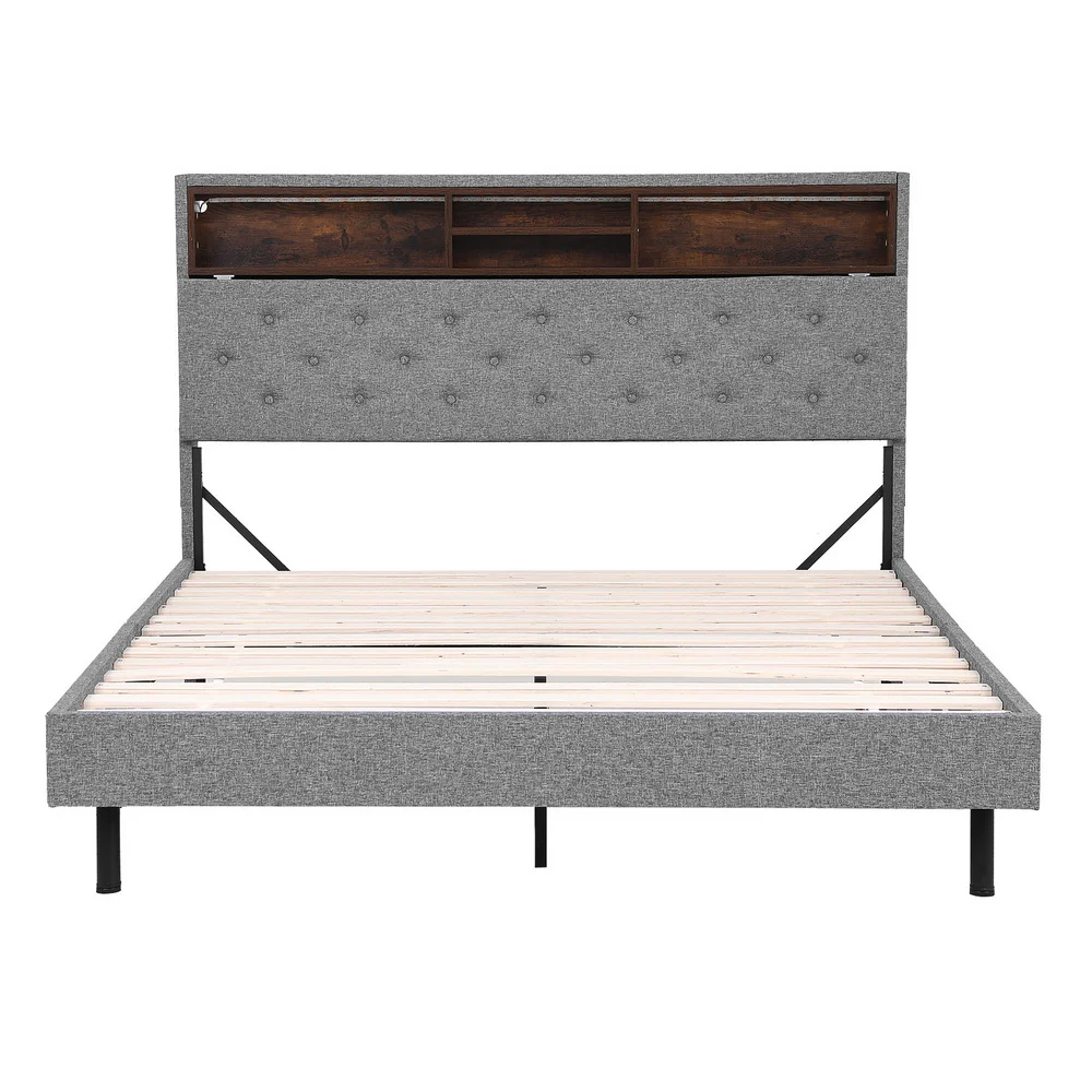 Artiss Queen Bed Frame Grey Faux Linen with LED Lights, Storage Headboard, Hidden Box, Timber Steel Base