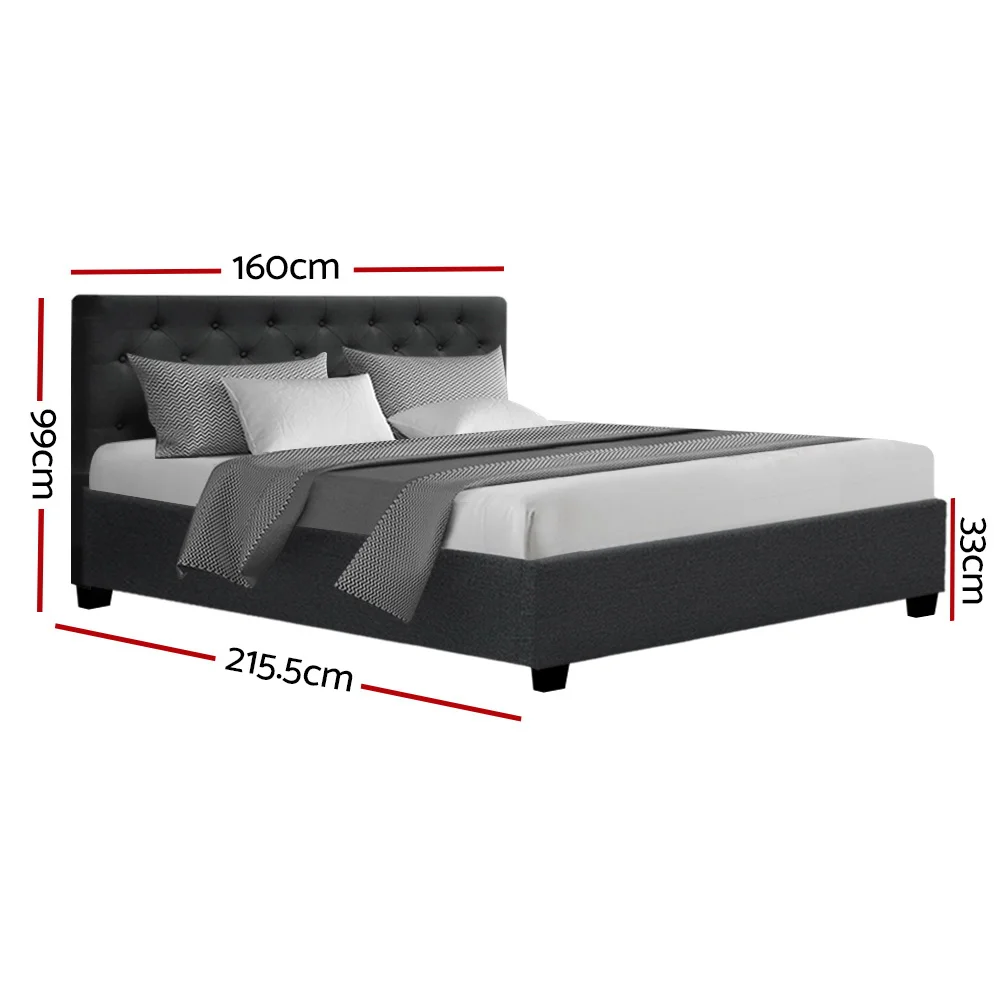 Artiss Vila Queen Bed Frame - Charcoal Faux Linen, Gas Lift Storage, Tufted Headboard, Steel Frame, Wooden Slats