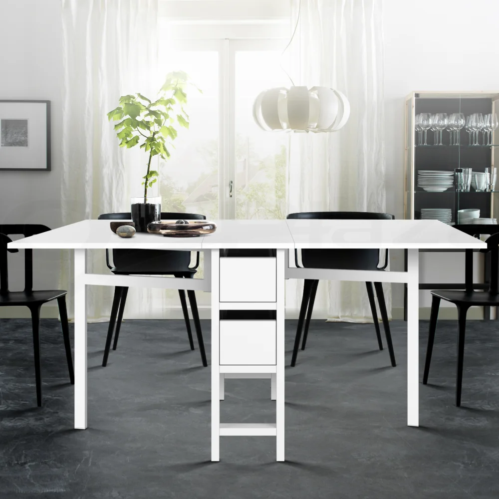Transform your dining space with the Artiss Dining Table, a masterpiece of functionality and style. This rectangular extendable table in a sleek white finish offers both elegance and practicality. Crafted from robust MDF board and supported by sturdy iron legs, this table is designed to withstand everyday use. The innovative gateleg design allows you to adjust the table size effortlessly, accommodating 4 to 6 guests comfortably. Its hard-wearing UV finish ensures longevity, while the extra under-frame support provides great stability when extended. Complete with two removable air-gap drawers for storing tableware or office supplies, this table boasts safe rounded edges for added safety.