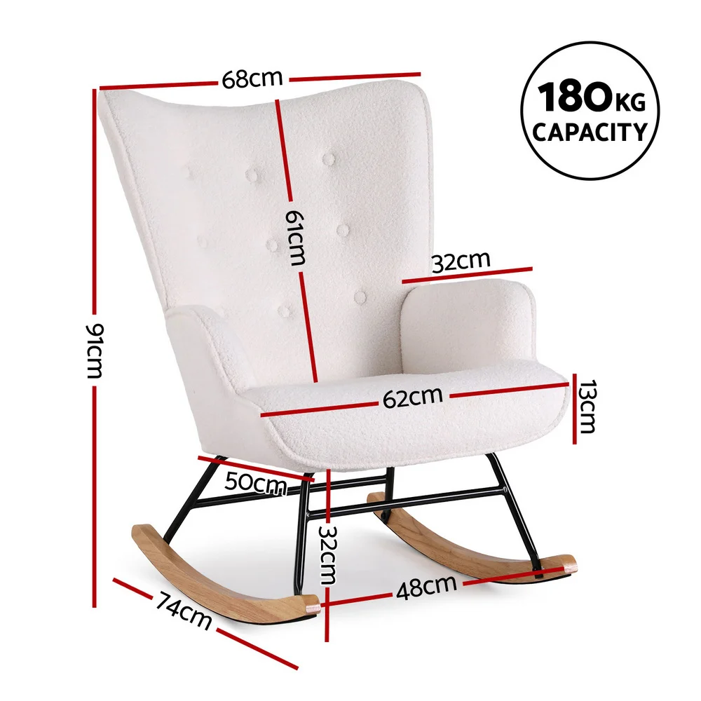Artiss White Bouclé Fabric Rocking Armchair - Ergonomic Design with Metal Frame, Rubber Wood Legs, 180kg Capacity