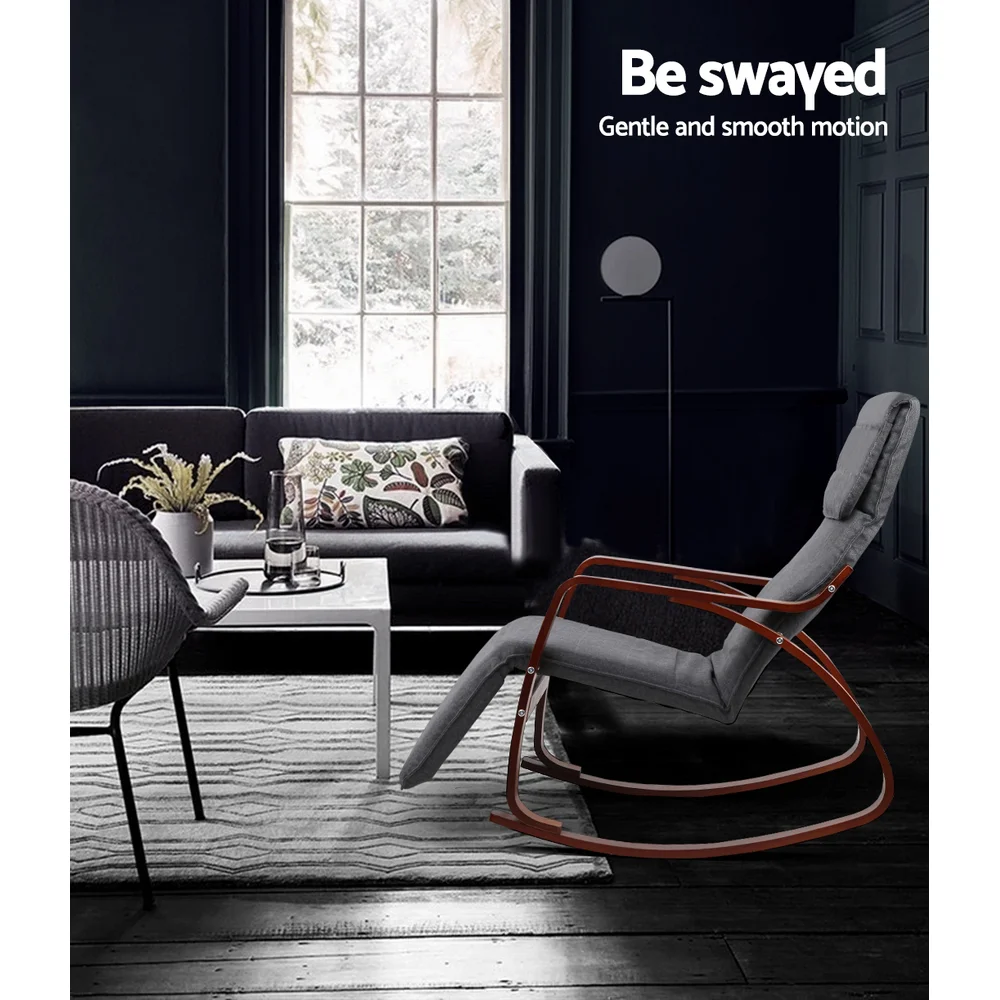 Discover ultimate relaxation with the Artiss Rocking Armchair Footrest Nursing Charcoal Afton. This Bentwood Rocking Armchair, crafted from durable Birch plywood, offers a stylish blend of comfort and elegance. The chair boasts a soft 4cm thick cushion and a robust steel and heavy-duty PP structure, ensuring longevity. Its five-setting adjustable footrest provides customised comfort, while the removable and washable zipper cover ensures easy maintenance. With a simple yet contemporary design, this armchair is your perfect relaxation partner. Cradle yourself in comfort today!