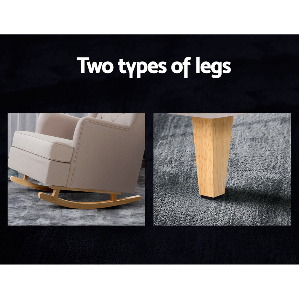Experience the ultimate in relaxation with the Artiss Gaia Rocking Chair. This versatile beauty comes with two sets of removable legs, allowing you to enjoy it as a soothing rocking chair or a stylish stationary chair. Perfect for any space, from the living room to the nursery, its elegant tufted wingback and faux linen fabric elevate any décor. With extra thick foam padding and a reinforced wooden frame, comfort and durability are guaranteed. Protect your floors with anti-scratch feet pads. Assembly is a breeze!