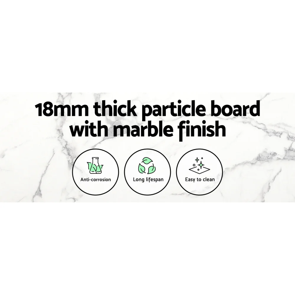 Elevate your dining experience with the Artiss Dining Table Round Marble Effect. This table offers a chic alternative to real marble, crafted from particle board with a marble finish and sturdy metal legs. Its minimalist design and smooth edges ensure both style and safety, while the anti-rust, powder-coated steel legs support up to 90kg. Perfect for any home décor, this table comfortably seats four, ideal for dinners, book clubs, or board games. Enjoy luxury without the price tag with easy assembly and a 1-year warranty.