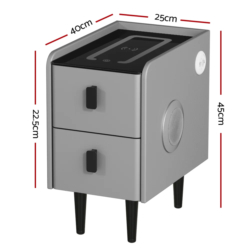 Artiss AIDA Smart Bedside Table 2 Drawers Grey PU Leather, LED Lights, Wireless Charging, Bluetooth Speaker, 45cm