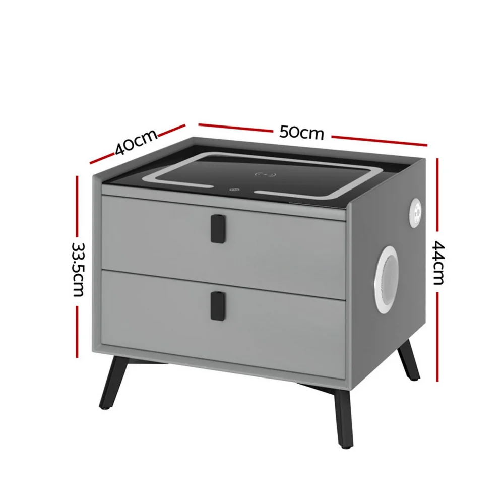 Elevate your space with the Artiss Aika Smart Bedside Table, a fusion of style and tech. Featuring wireless charging, USB ports, and a Bluetooth speaker, it's perfect for modern living. Crafted with high-quality MDF, PU leather, and a tempered glass top, it combines durability and elegance. Two spacious drawers and adjustable LED lights enhance its functionality. With sturdy metal legs and anti-slip pads, it's built to last. Easy to clean and assemble, it's a chic centrepiece for any room.