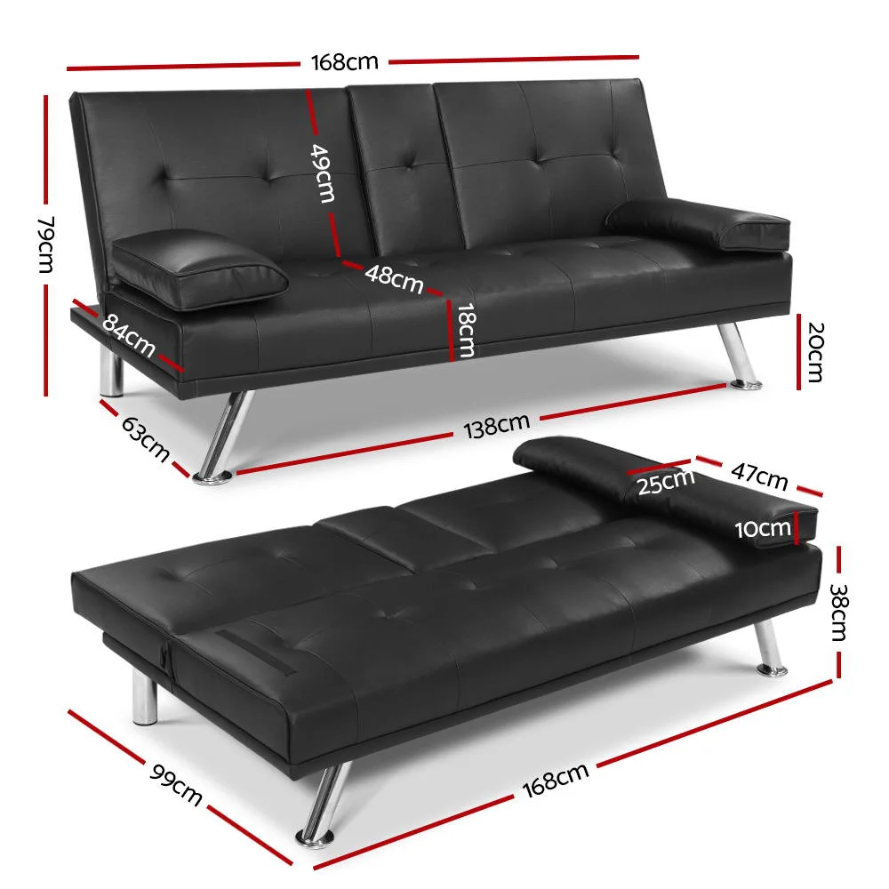 Artiss 3-Seater Sofa Bed, Black PU Leather, 188CM, Convertible Couch with Cup Holders, Adjustable Backrest