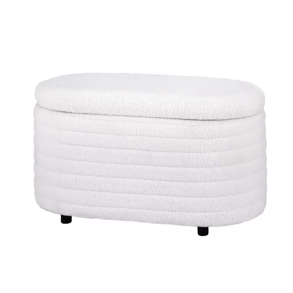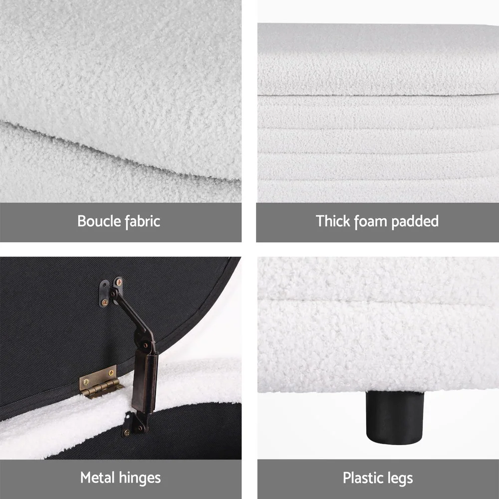 Artiss Storage Ottoman Blanket Box 87cm Bouclé Fabric Oval, White, Padded Seat, Hinged Lid, Bedroom Organiser