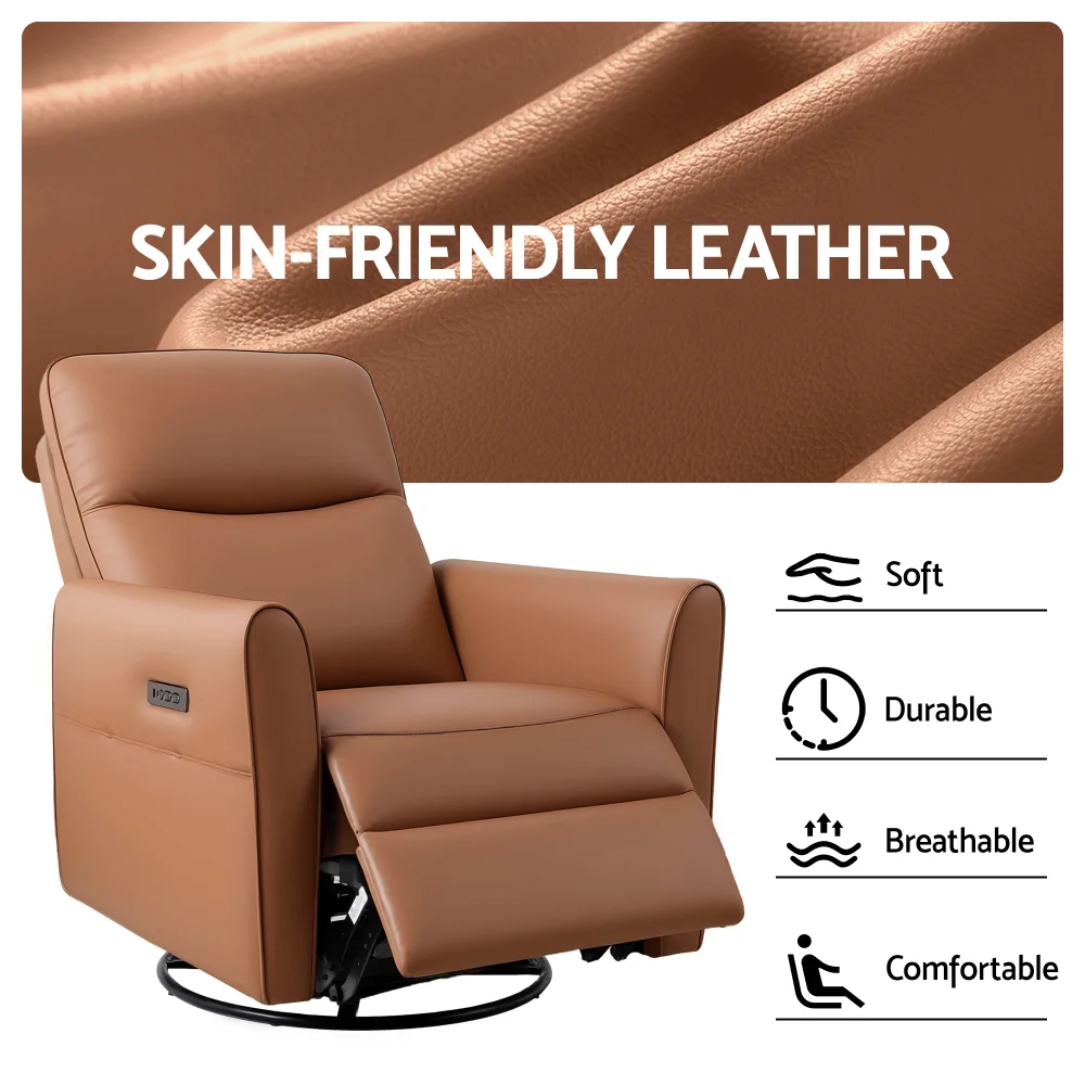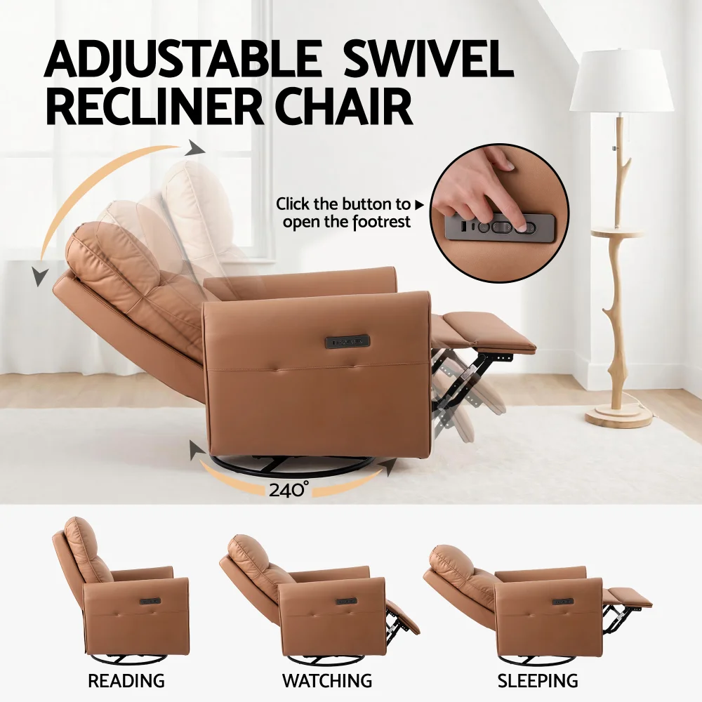 Artiss Leather Swivel Recliner Chair with USB & LED, 240° Swivel, 135° Recline, Adjustable Headrest, Brown, 81x81x105