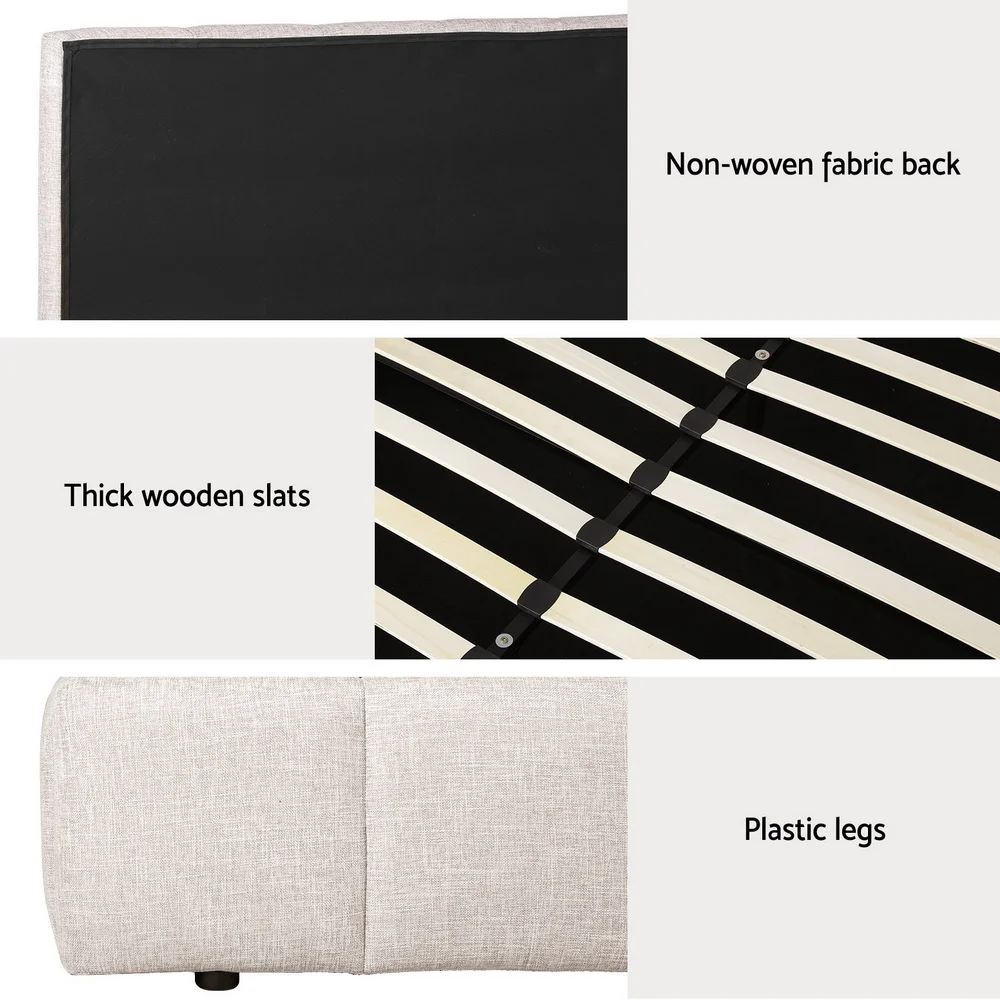 Take restful nights to a new level with the Artiss Tette Bed Frame. Crafted from solid pine wood with sturdy plywood slats, this double-size frame ensures robust support and long-lasting durability. Upholstered in premium beige linen fabric with plush padding and a smooth-edge finish, it delivers a perfect blend of comfort and style. Enjoy generous gas lift storage with a non-woven fabric bottom and heavy-duty metal connectors for extra stability, sleep soundly and look fabulous every night.
